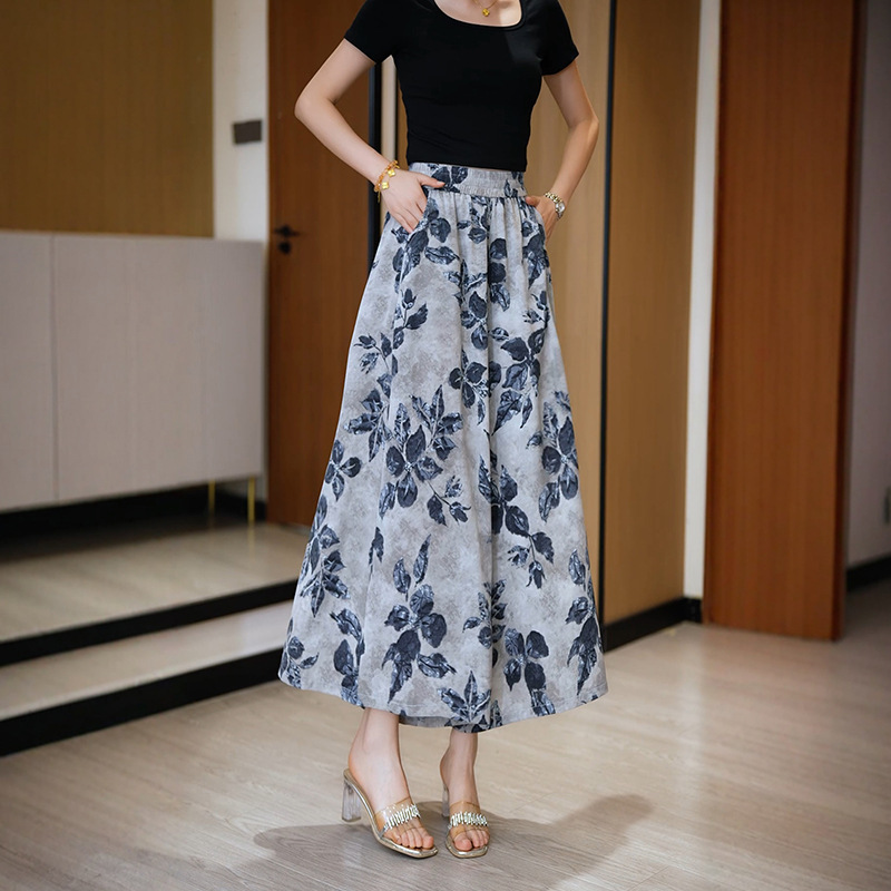 女性用レトロプリントスカートパンツ、夏の多用途でエレガントなスカートパンツ、ハイウエスト、ゆったりとしたドレープのワイドレッグカジュアルパンツ