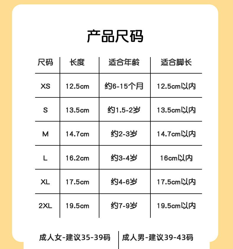 怎么选择合适的鞋码?:宝宝的脚需要留出一定的活动空间,建议按照宝宝净脚长加0.5cm-1cm选鞋码,如宝宝净脚长12.5cm,您可以选鞋底长13.5cm的鞋子,脚偏胖建议选大一码的(仅供参考)