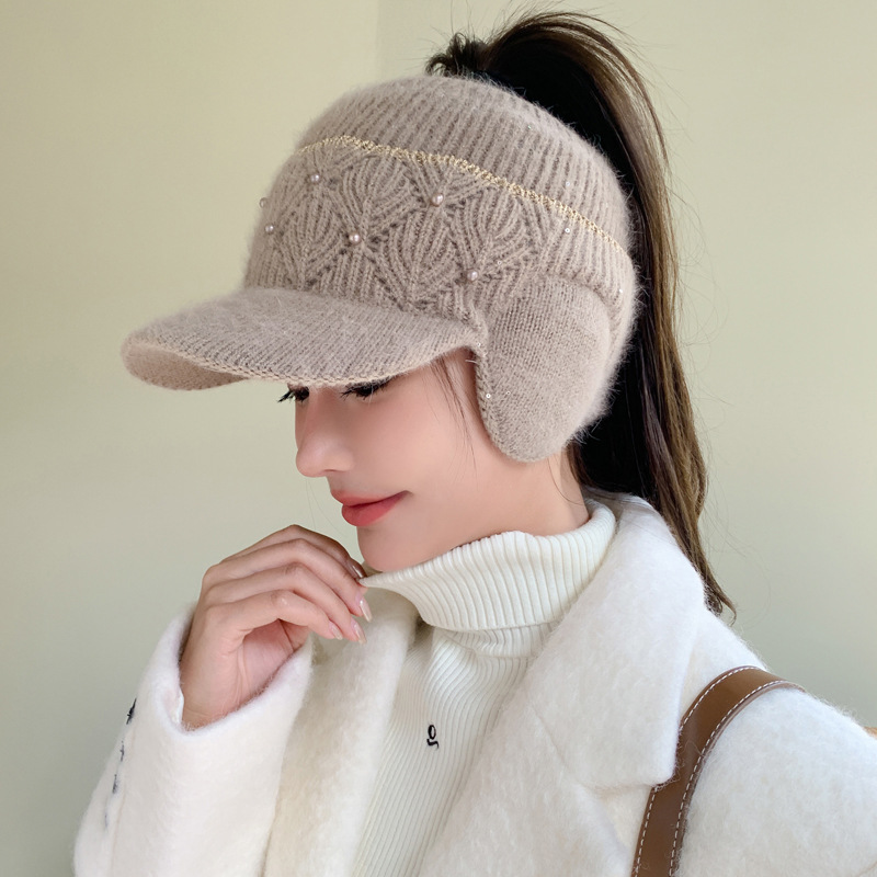 保暖空顶帽女秋冬季扎马尾针织棒球帽加厚户外骑行防寒护耳鸭舌帽