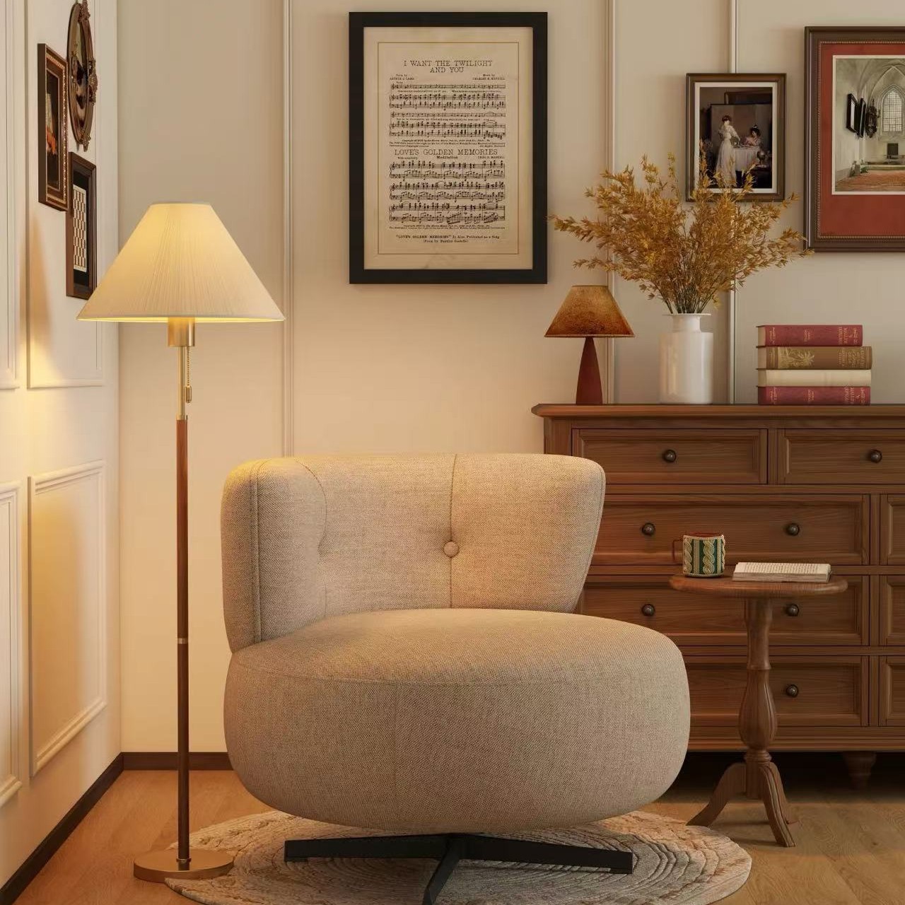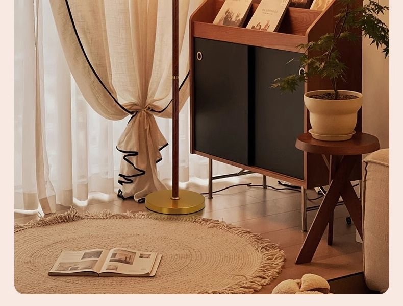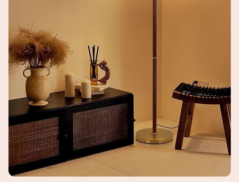 アメリカンレトロスタイルフロアランプウォールナットカラーファブリックソファランプアンティークスタイル無垢材雰囲気垂直ランプ