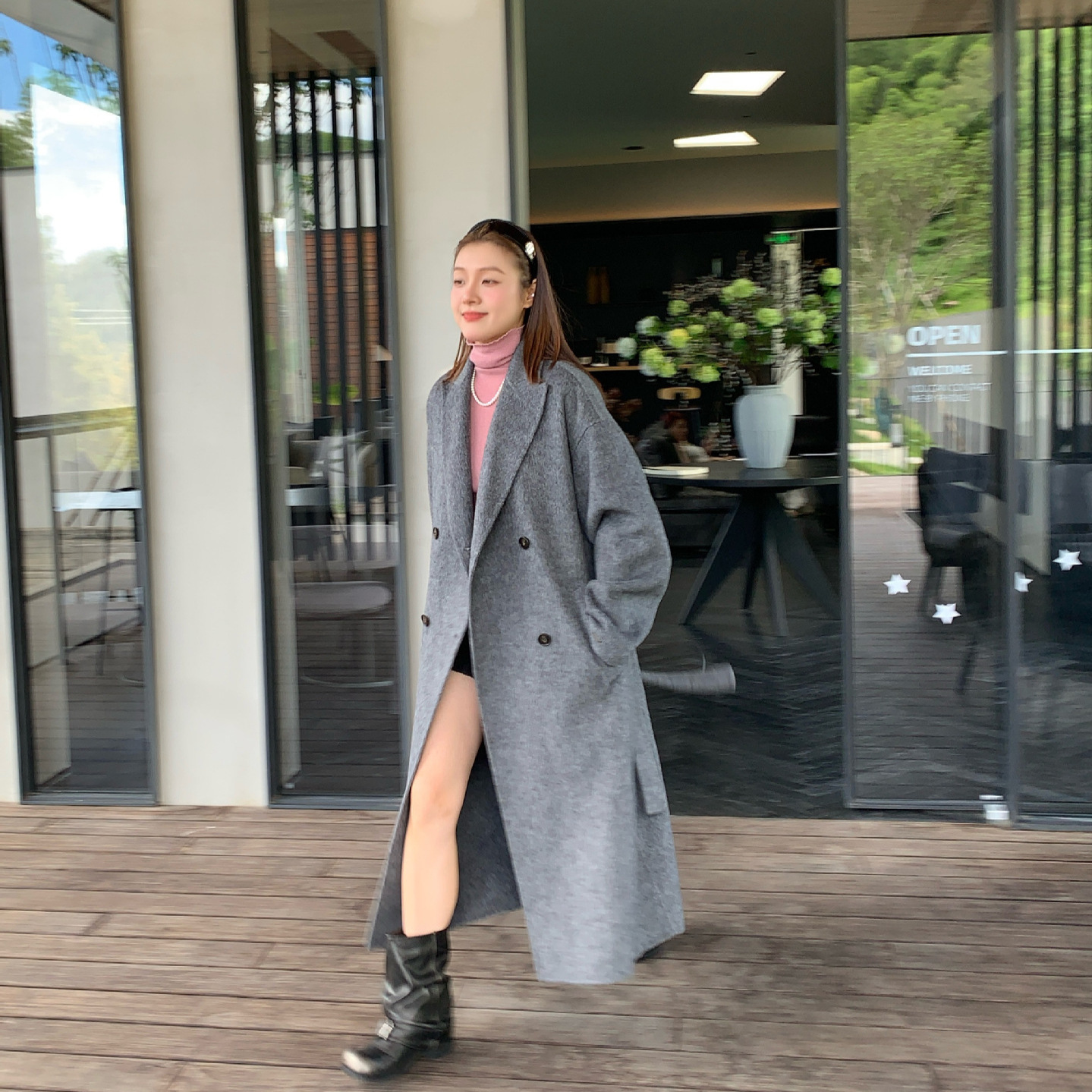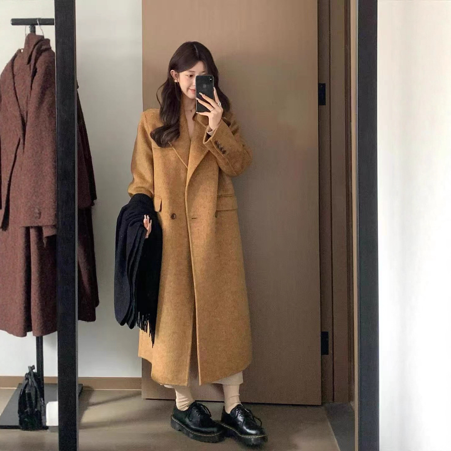 韩系翻领单排扣直筒复古宽松腰带中长款双面羊绒大衣女毛呢外套冬