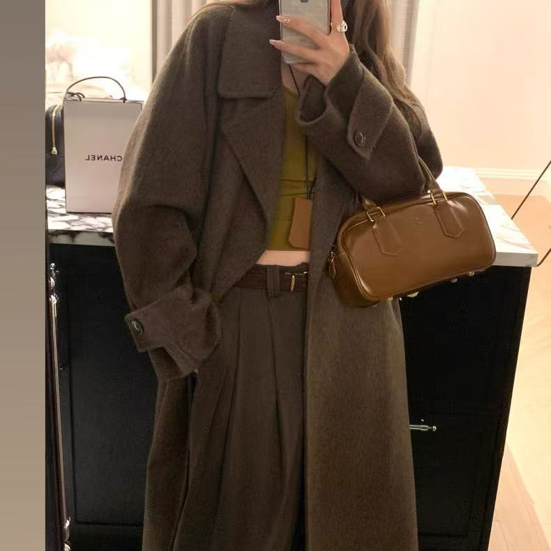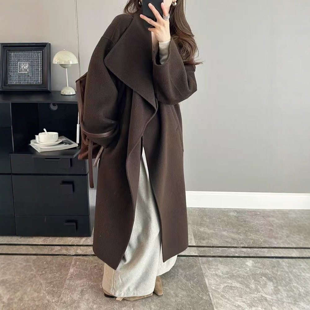 大翻领棕咖色老钱风双面羊毛大衣女中长款慵懒秋冬高级感毛呢外套