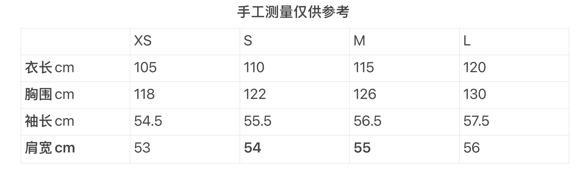 尺码 XS(衣长105左右),S(衣长110左右),M(衣长115左右),L(衣长120左右)