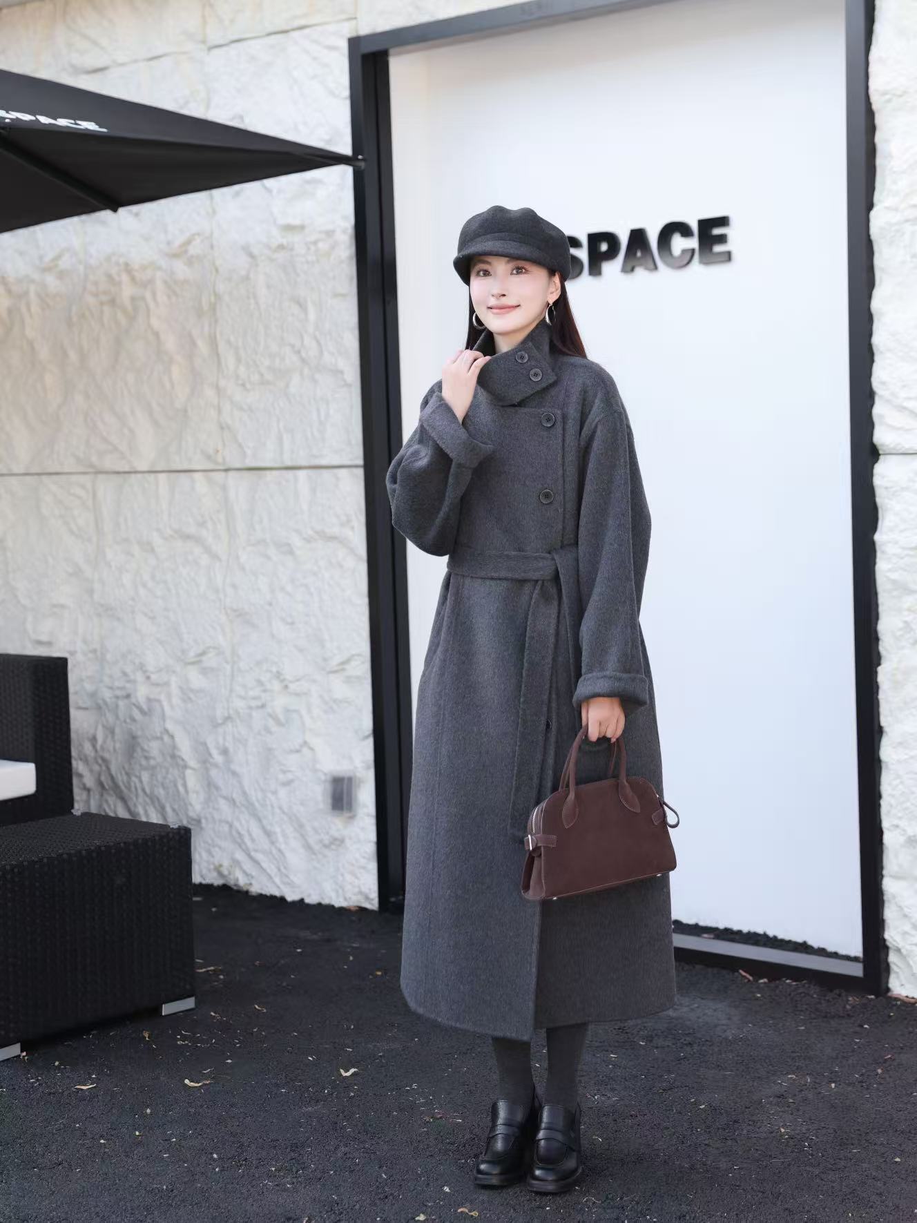 升级羊绒版!立领单排扣系带新款双面羊毛大衣女长款小个子25秋冬