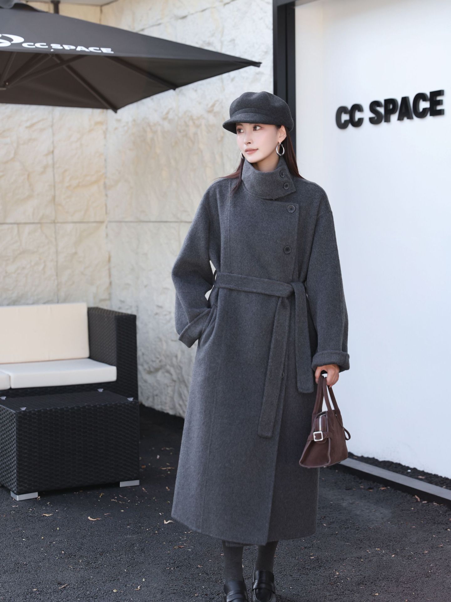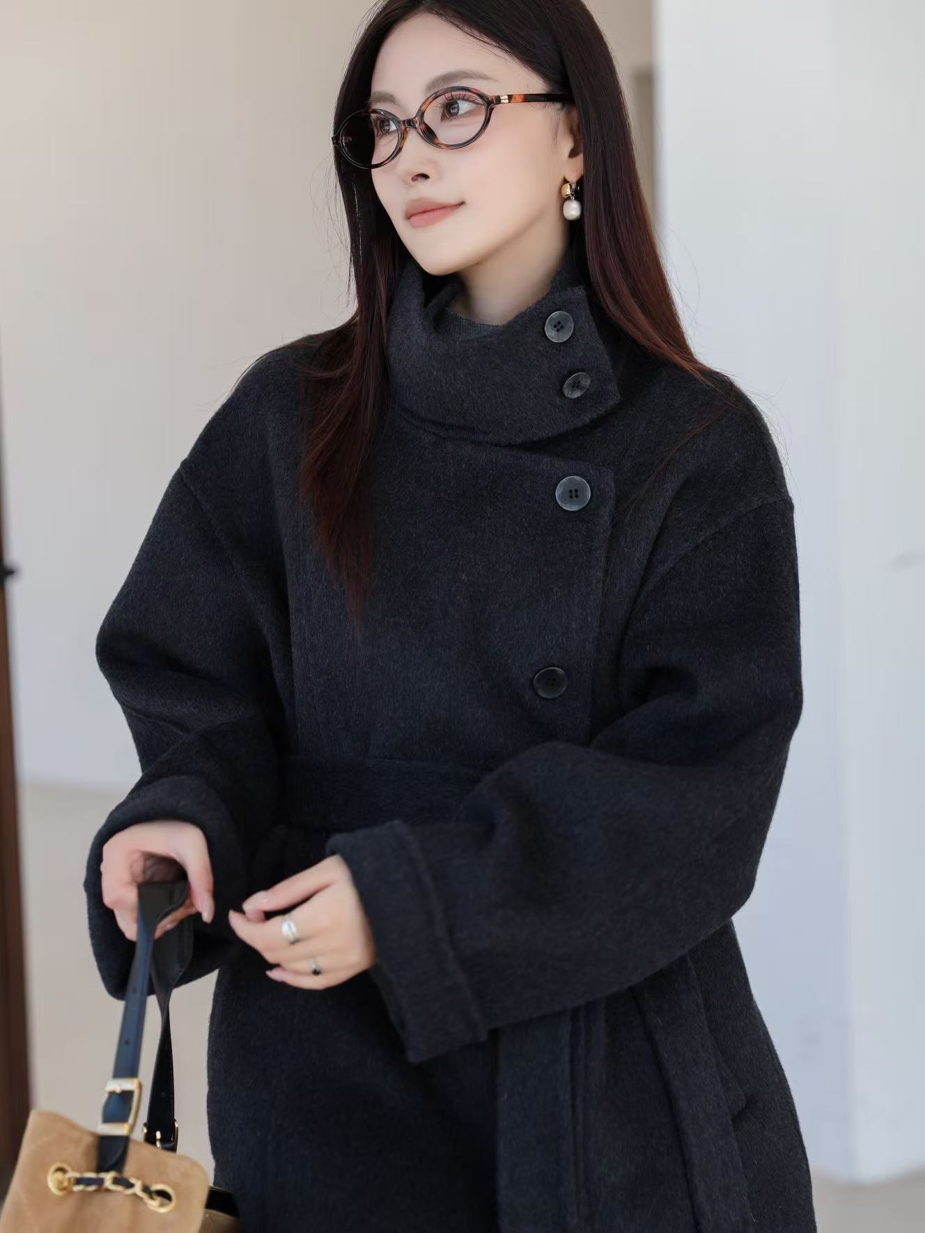 カシミヤバージョンにアップグレード!スタンドカラー、シングルボタン、紐付き、新作両面ウールコート、レディースショート丈、小柄な方向け、25秋冬