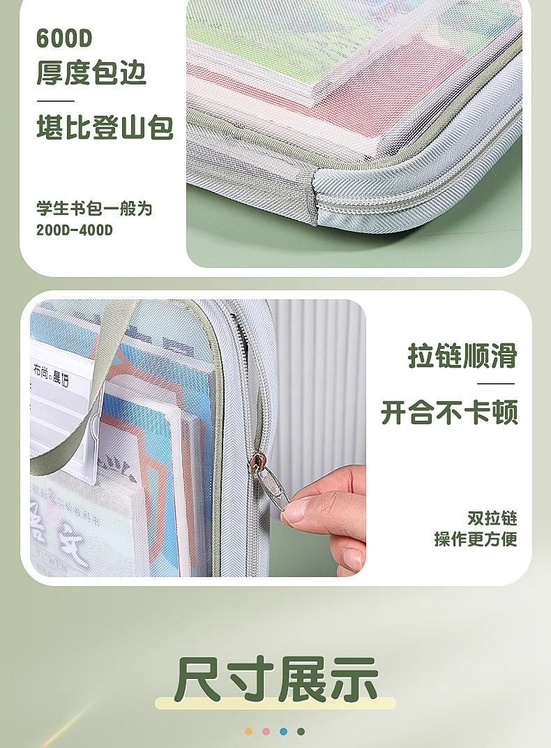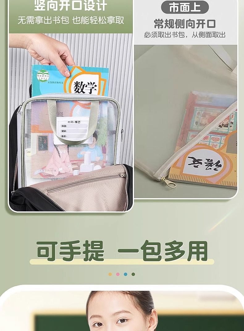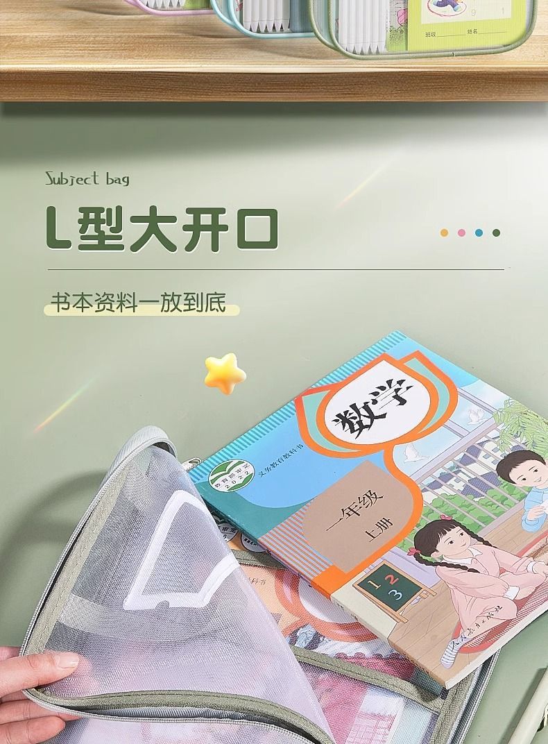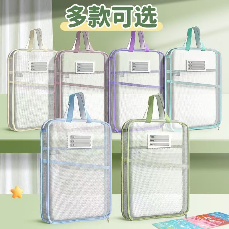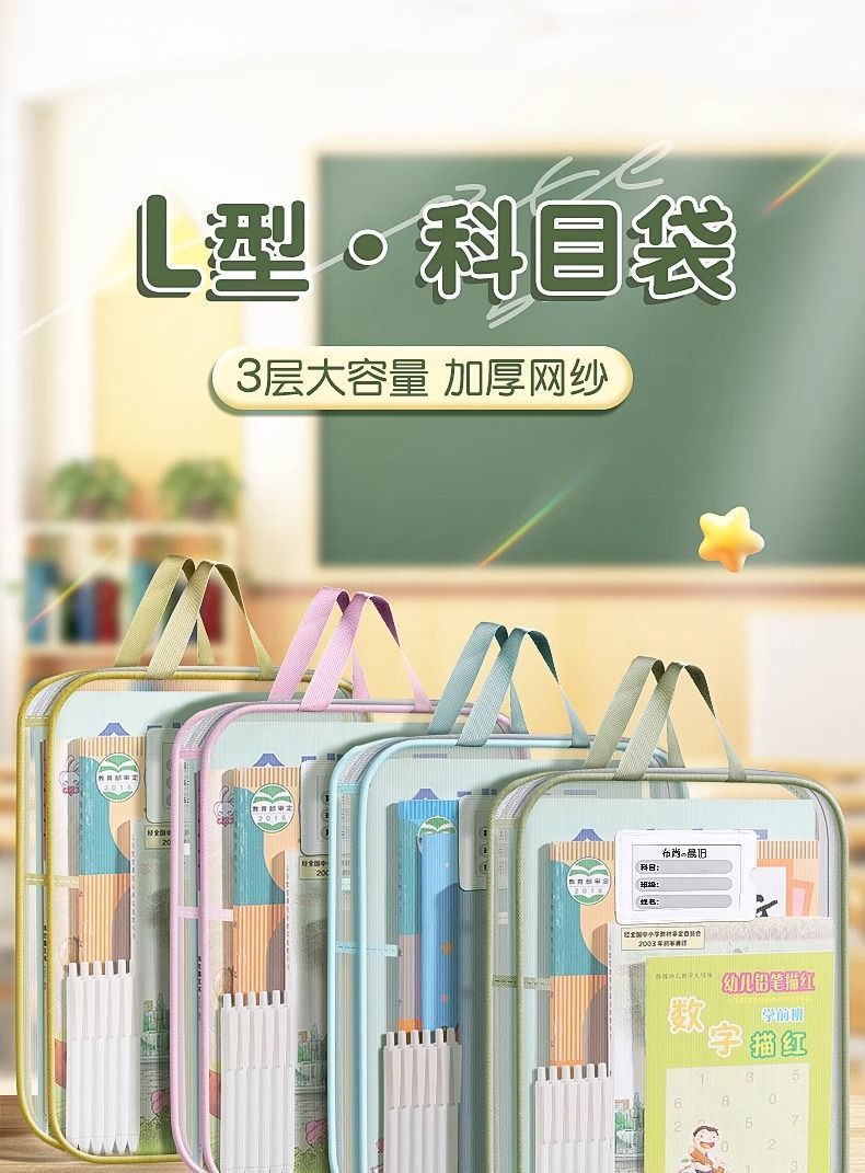 L型科目分类袋小学生手提拎书袋学科文件袋拉链式A4透明网大开口