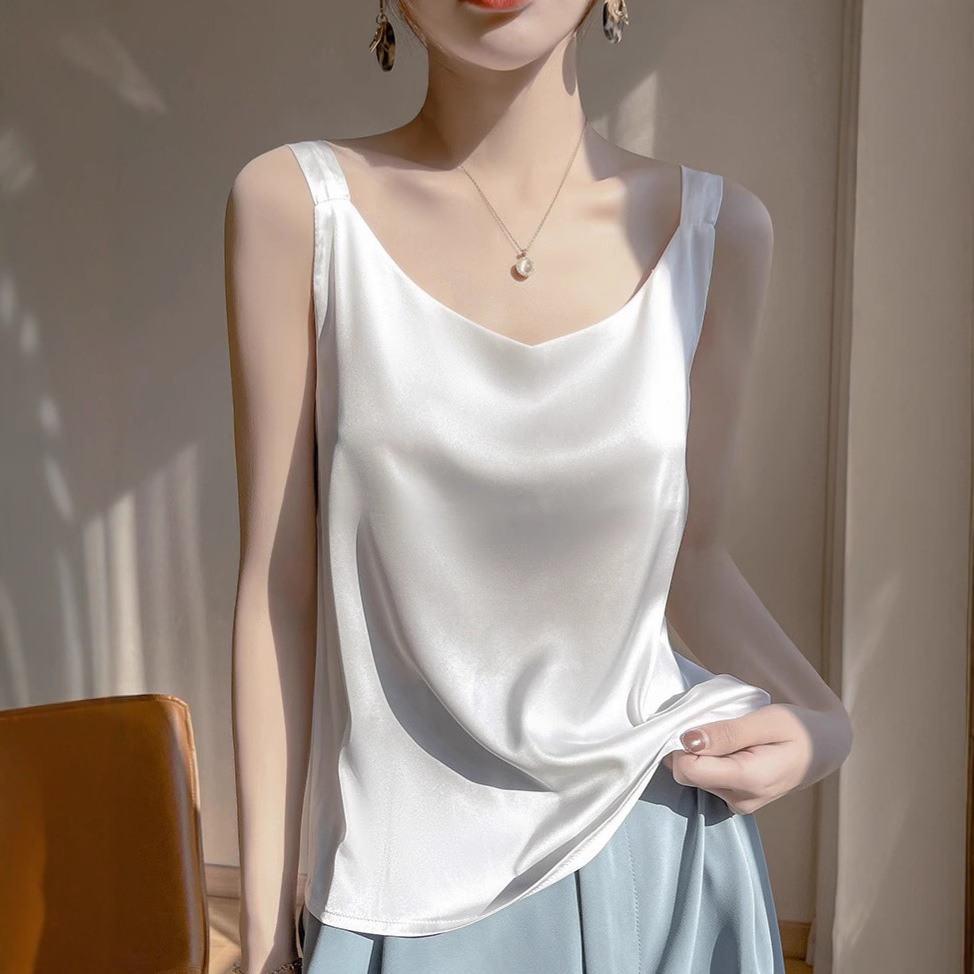 ストラップのベストの女性のシルクの酢酸のサテンの2025新型の白い袖なしの外は百合の薄いタイプの底の上着を着ます。