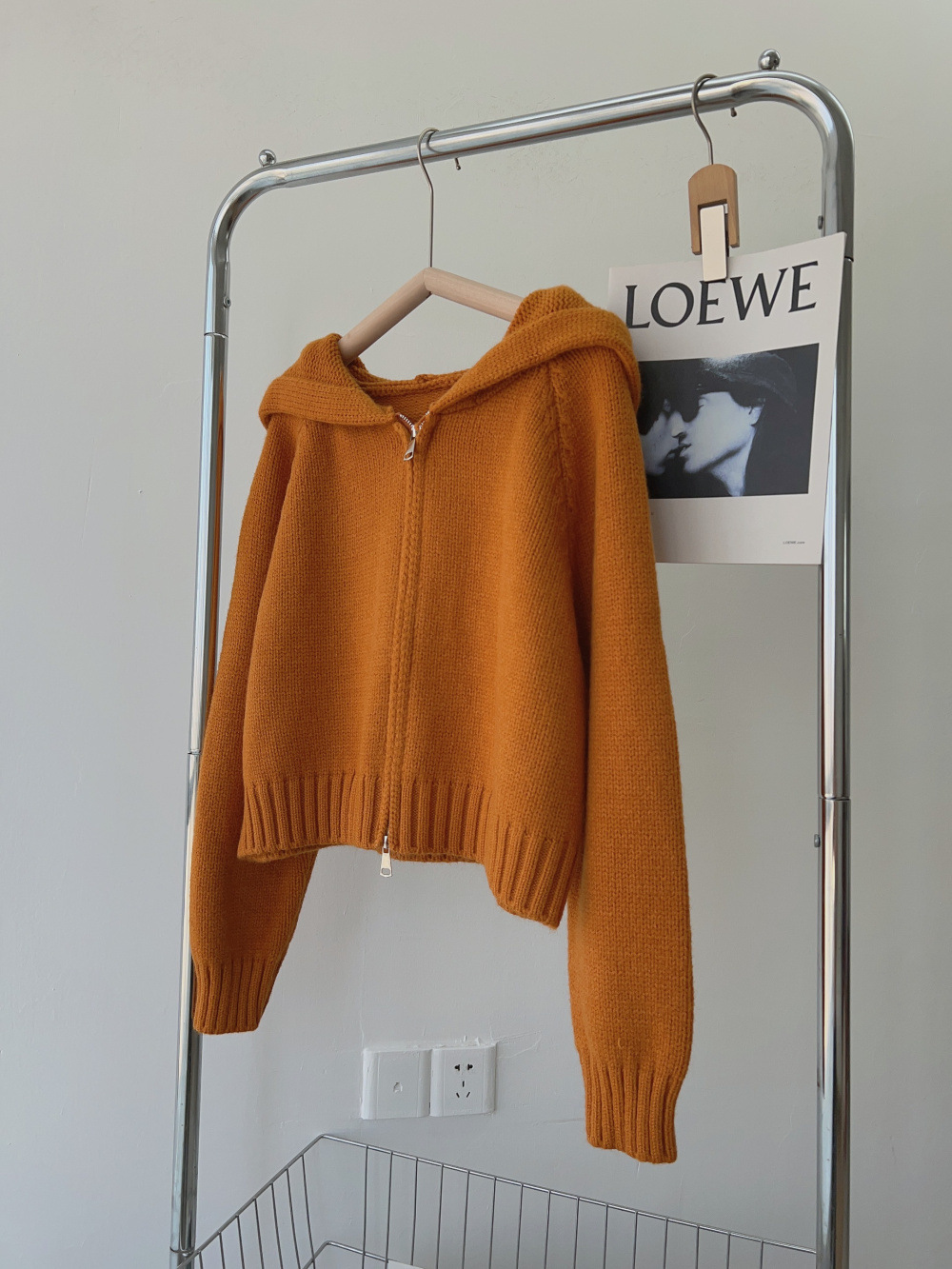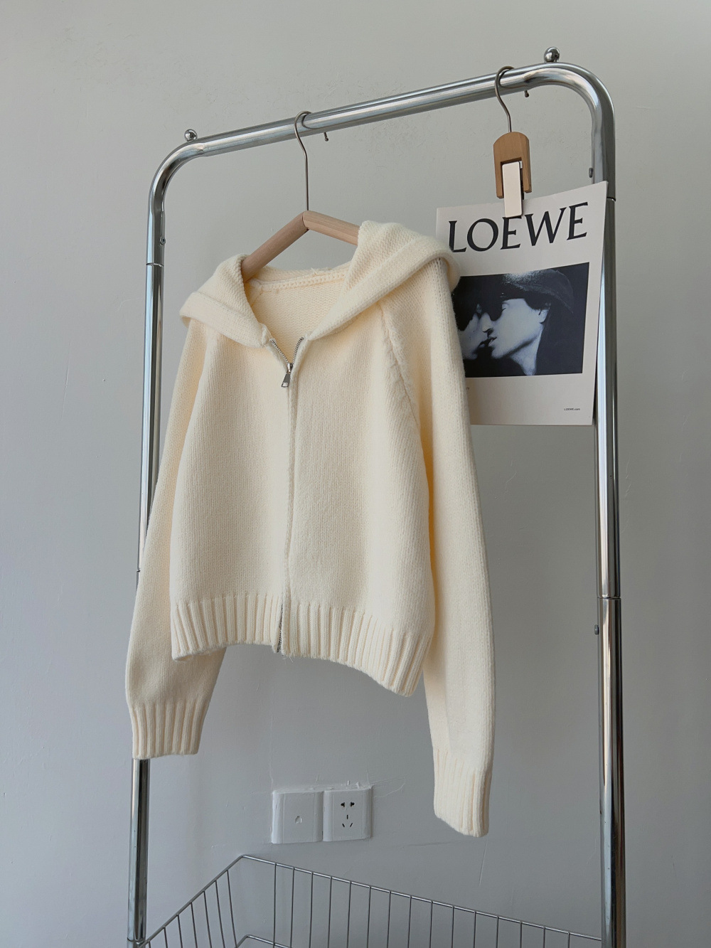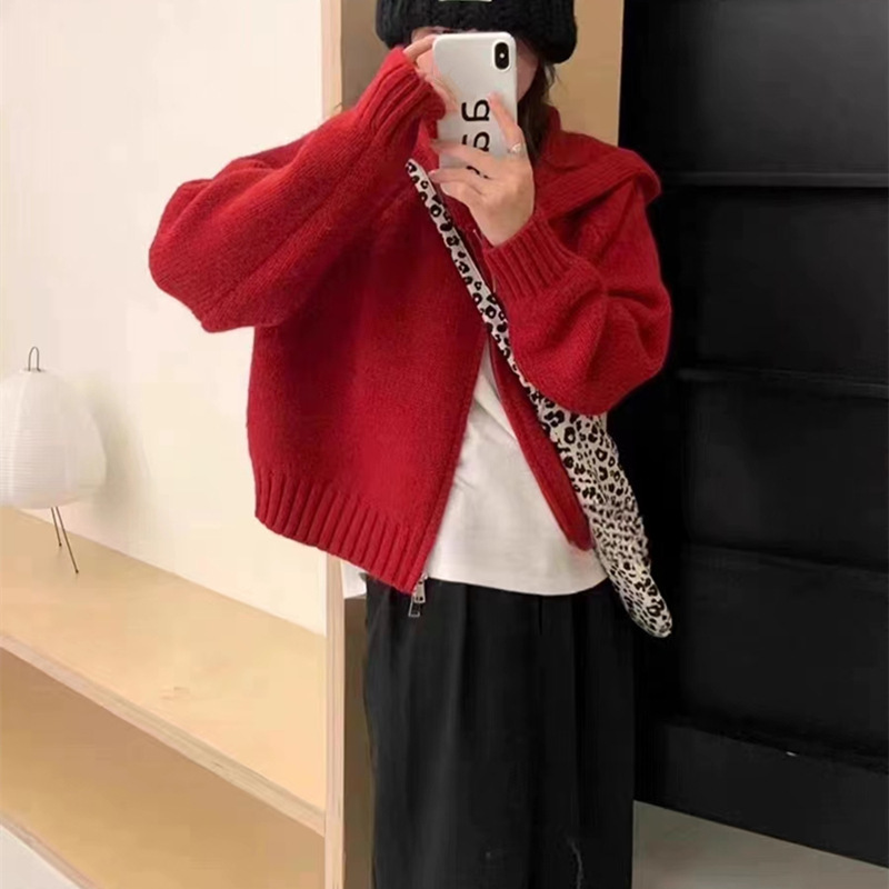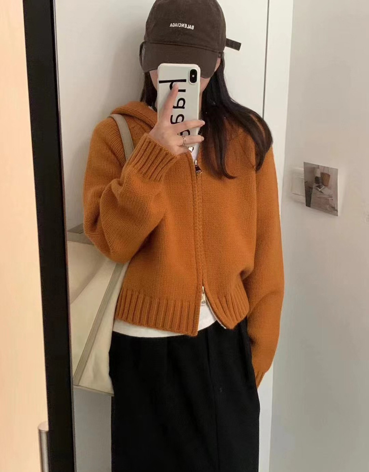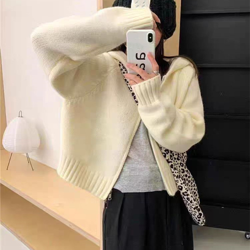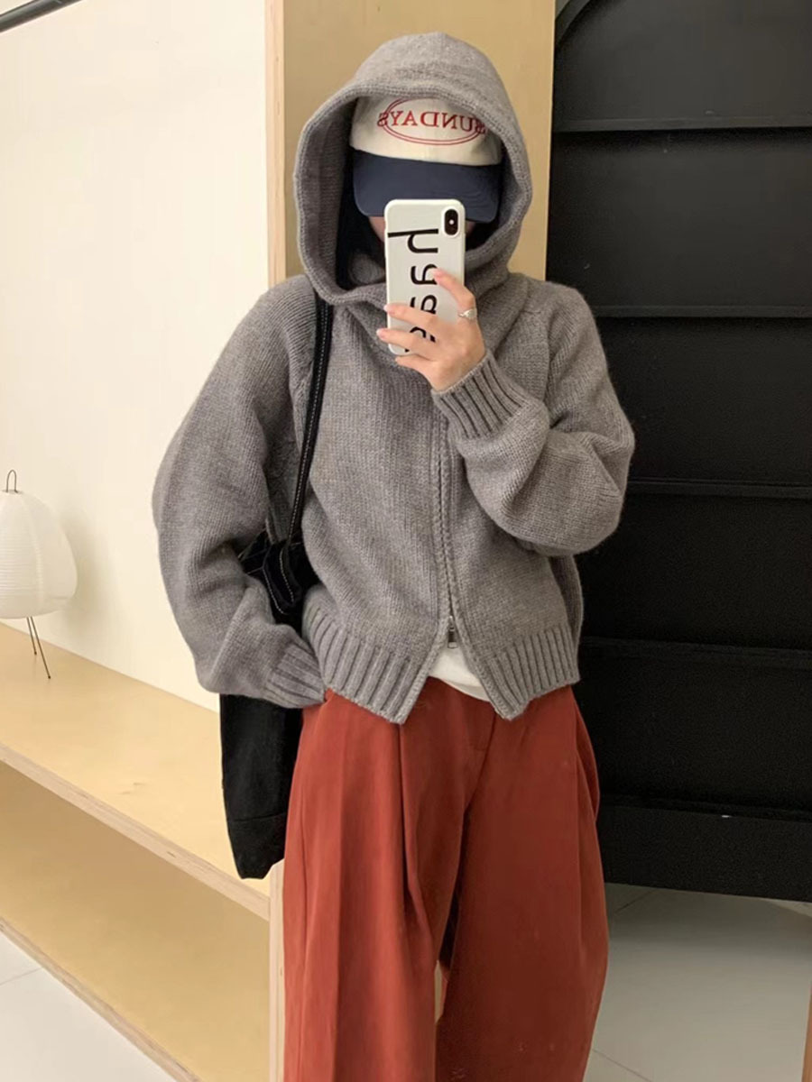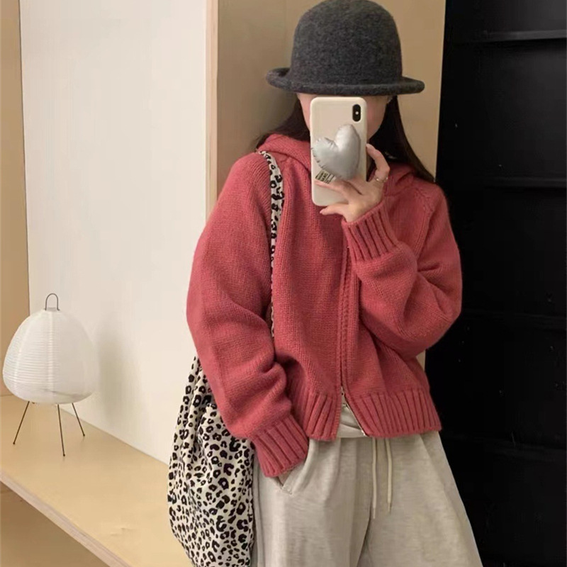 韩系双拉链连帽针织开衫女秋冬新款慵懒风设计感软糯宽松毛衣外套