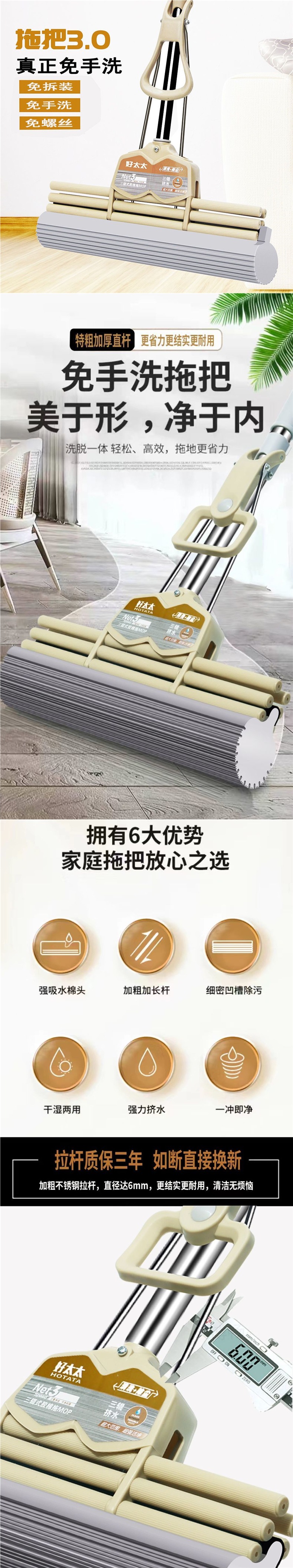 好太太海绵拖把家用懒人一拖净免手洗滚轮吸水挤水胶棉拖把头