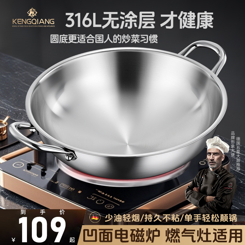 铿锵316不锈钢圆底双耳家用无涂层尖底不粘炒菜锅大号燃气灶专用