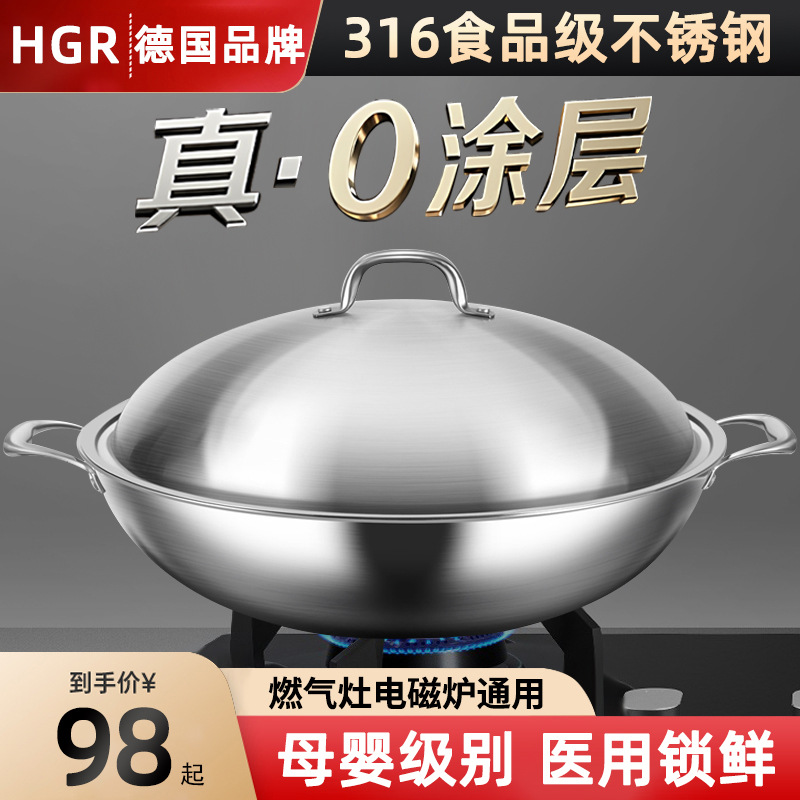 德国特厚316不锈钢炒锅家用无水燃气电磁炉无涂层平底不粘炒菜锅