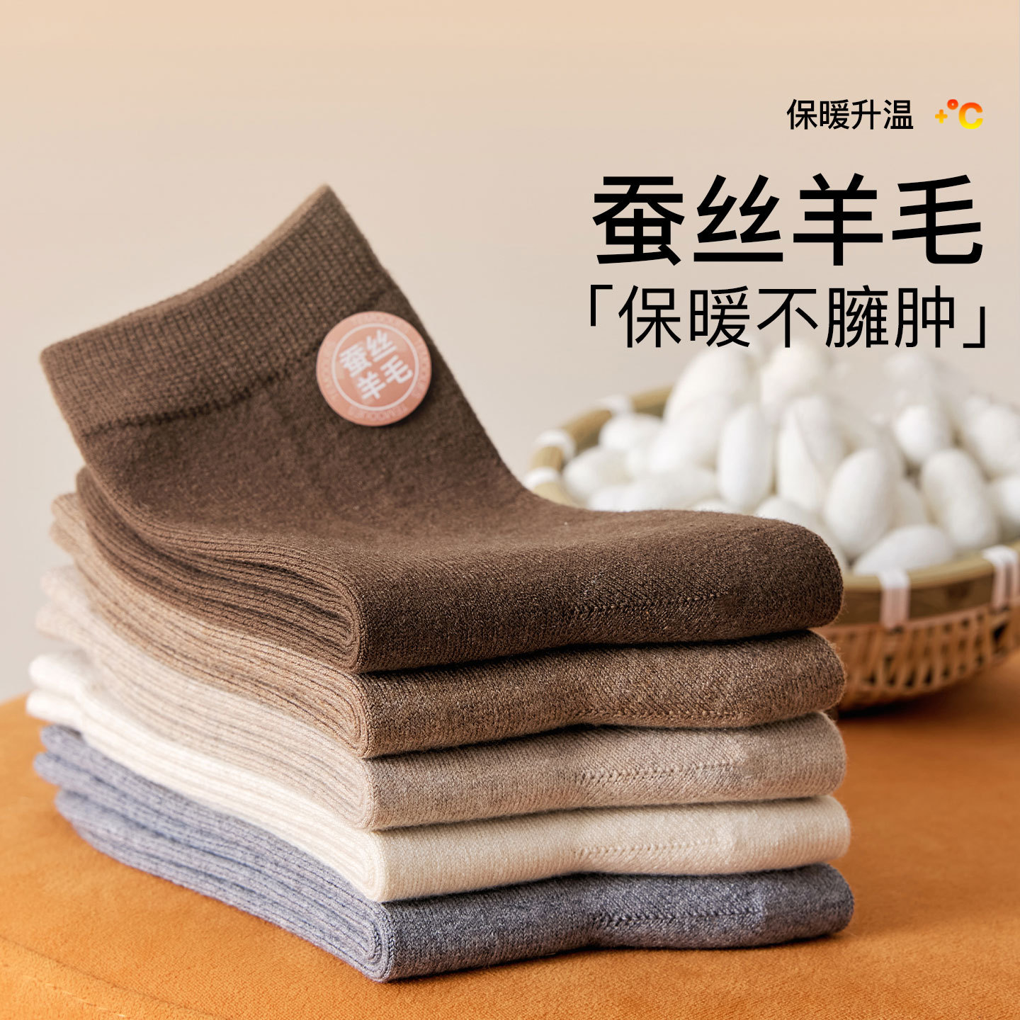 羊毛袜子女款秋冬桑蚕丝中筒袜加厚保暖女士月子袜咖色无骨堆堆袜