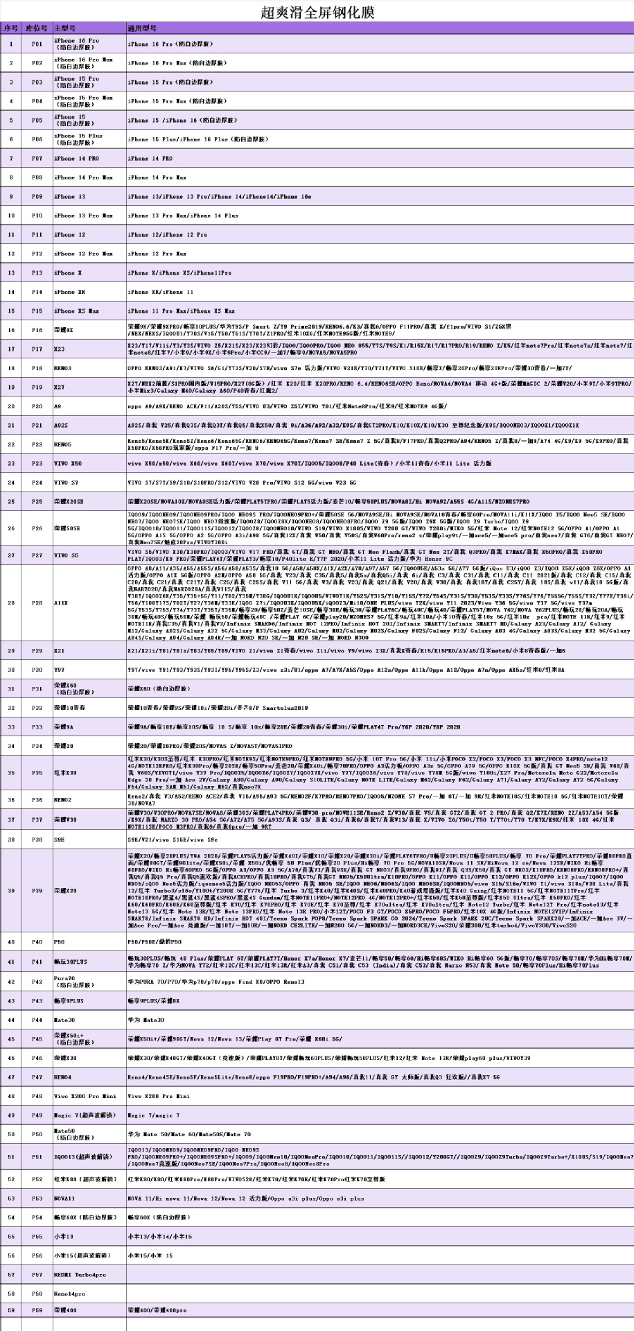 唛品·超爽滑O型对折钢化膜套装(61型号305张配箱子),P01 苹果16pro/17(380防白边厚胶),P02 苹果16promax(380防白边厚胶),P03 苹果15pro(380防白边厚胶),P04 苹果15promax(380防白边厚胶),P05 苹果15/16(380防白边厚胶),P06 苹果15plus/16plus(380防白边厚胶),P07 苹果14pro(单张带包)),P08 苹果14promax(单张带包)),P09 苹果13/13pro/14/16E(单张带包)),P10 苹果13promax/14plus(单张带包)),P11 苹果12/12pro(单张带包)),P12 苹果12promax(单张带包)),P13 苹果X/11pro(单张带包),P14 苹果XR/11(单张带包),P15 苹果XSMAX/11PROMAX(单张带包),P16 主型号 荣耀9X (单张带包),P17 主型号 X23 (单张带包),P18 主型号 RENO3 (单张带包),P19 主型号 X27 (单张带包),P20 主型号 A9 (单张带包),P21 主型号 A92S (单张带包),P22 主型号 RENO5 (单张带包),P23 主型号 VIVOX50 (单张带包),P24 主型号 VIVOS7 (单张带包),P25 主型号 荣耀X20SE (单张带包),P26 主型号 荣耀50SE (单张带包),P27 主型号 VIVOS5 (单张带包),P28 主型号 A11X (单张带包),P29 主型号X21 (单张带包),P30 主型号 Y97 (单张带包),P31 主型号 荣耀X60 (380防白边厚胶),P32 主型号荣耀10青春 (单张带包),P33 主型号 荣耀9A (单张带包),P34 主型号 荣耀20 (单张带包),P35 主型号 红米K30 (单张带包),P36 主型号 RENO2 (单张带包),P37 主型号 荣耀V30 (单张带包),P38 主型号 VIVOS9E (单张带包),P39 主型号 荣耀X20 (单张带包),P40 主型号 P50 (单张带包),P41 主型号 畅玩30plus (单张带包),P42 主型号 Pura70/P70 (380防白边厚胶),P43 主型号 畅享9plus (单张带包),P44 主型号 MATE30 (单张带包),P45 主型号 荣耀X50i+ (380防白边厚胶),P46 主型号 荣耀X30 (单张带包),P47 主型号 RENO4 (单张带包),P48 主型号 X200promini (单张带包),P49 主型号 Magic7 (超声波解锁),P50 主型号 MATE50 (380防白边厚胶),P51 主型号 IQOO13 (超声波解锁),P52 主型号 红米K80 (超声波解锁),P53 主型号 NOVA11(单张带包),P54 主型号 畅享60X (380防白边厚胶),P55 主型号 小米13 (单张带包),P56 主型号 小米15 (超声波解锁),P57 主型号 红米Turbo4pro (单张带包),P58 主型号 RENO14pro (单张带包),P59 主型号 荣耀400/400pro (单张带包),P60 主型号 苹果17pro (380防白边厚胶),P61 主型号 苹果17promax (380防白边厚胶),P62 主型号 苹果17Air (380防白边厚胶),P63 主型号 VIVOX200S (超声波解锁),P64 主型号 小米17/小米17pro (超声波解锁),P65 主型号 小米17promax (超声波解锁),P66 主型号 VIVOX300 (超声波解锁),P67 主型号 VIVOX300pro (超声波解锁),P68 主型号 荣耀Magic8 (超声波解锁),P69 主型号 IQOO15 (超声波解锁),P70 主型号FindX9pro (超声波解锁),P71 主型号 红米K90 (超声波解锁),P72 主型号真我GT8 (超声波解锁),P73 主型号 Mate80 (防白边厚胶),P74 主型号 Mate80promax (防白边厚胶),P75 主型号荣耀500pro (超声波解锁)