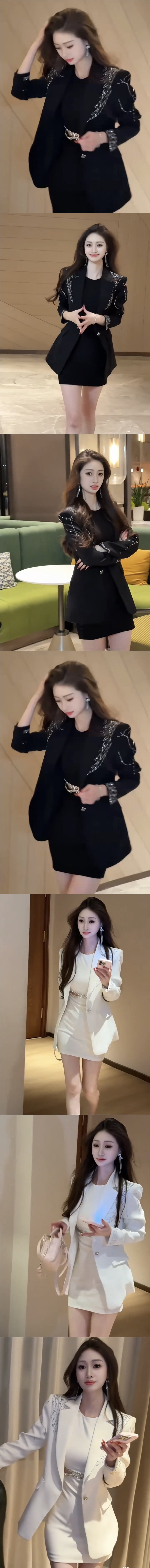 网红新款时尚西服套装裙2025洋气重工烫钻收腰显瘦外套+连衣裙