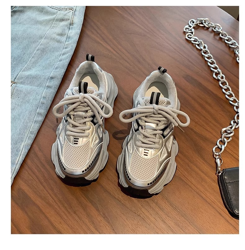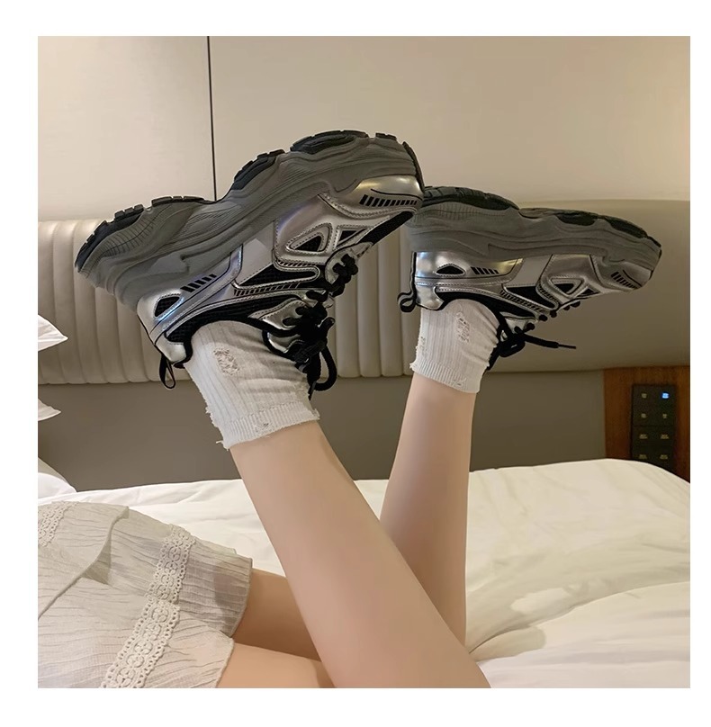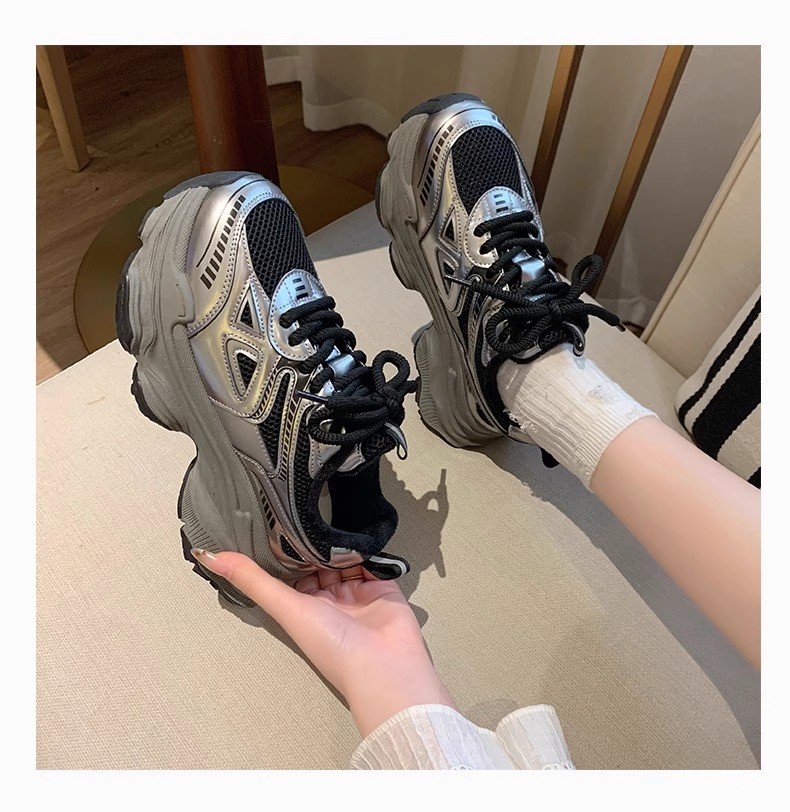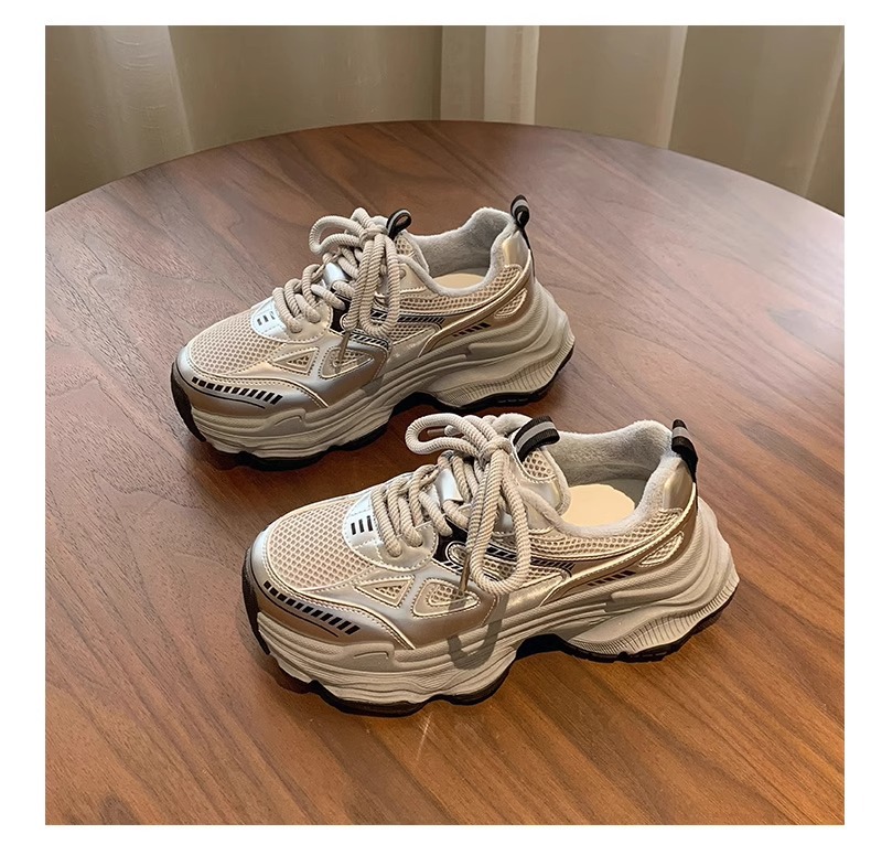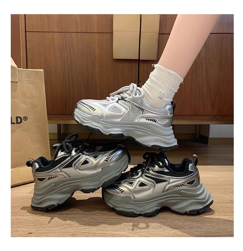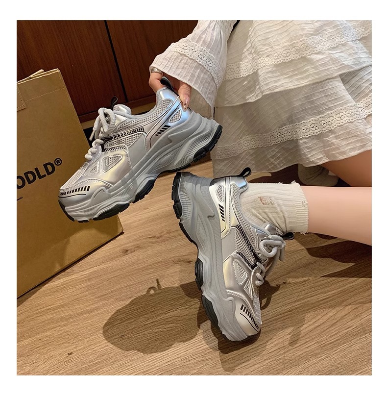 厚い底の銀色のお父さんの靴の女性の金の2025新型の春秋はネットの通気性を高めてパリの運動靴の靴を走ります。