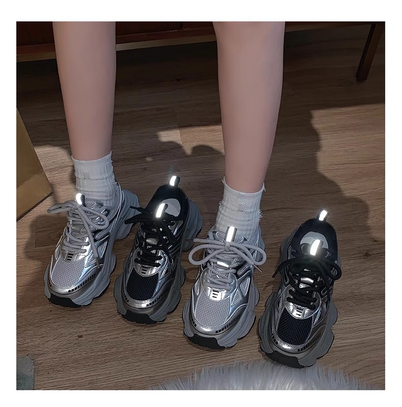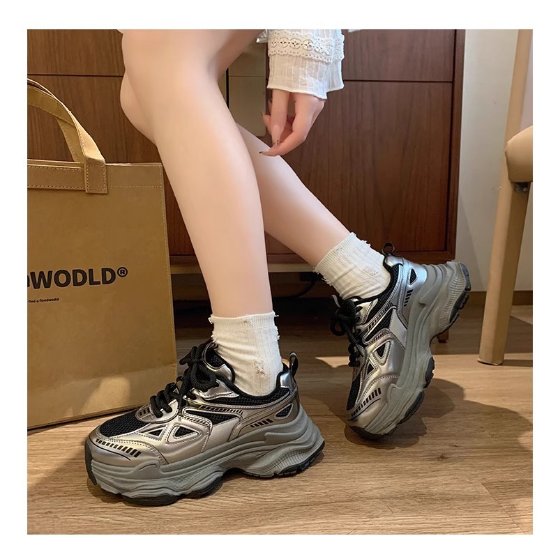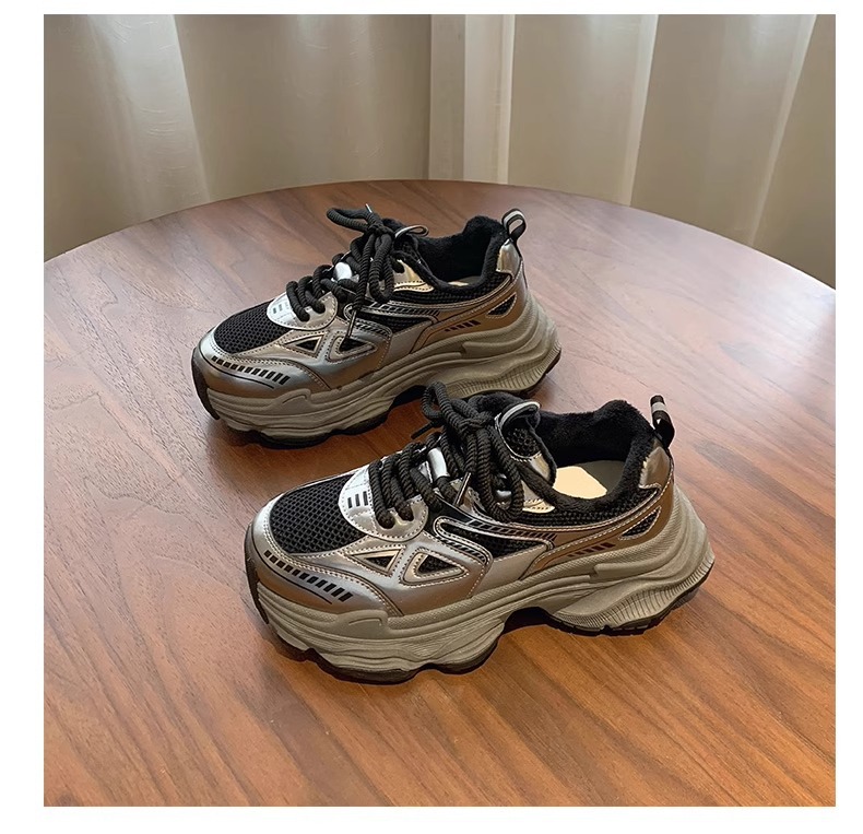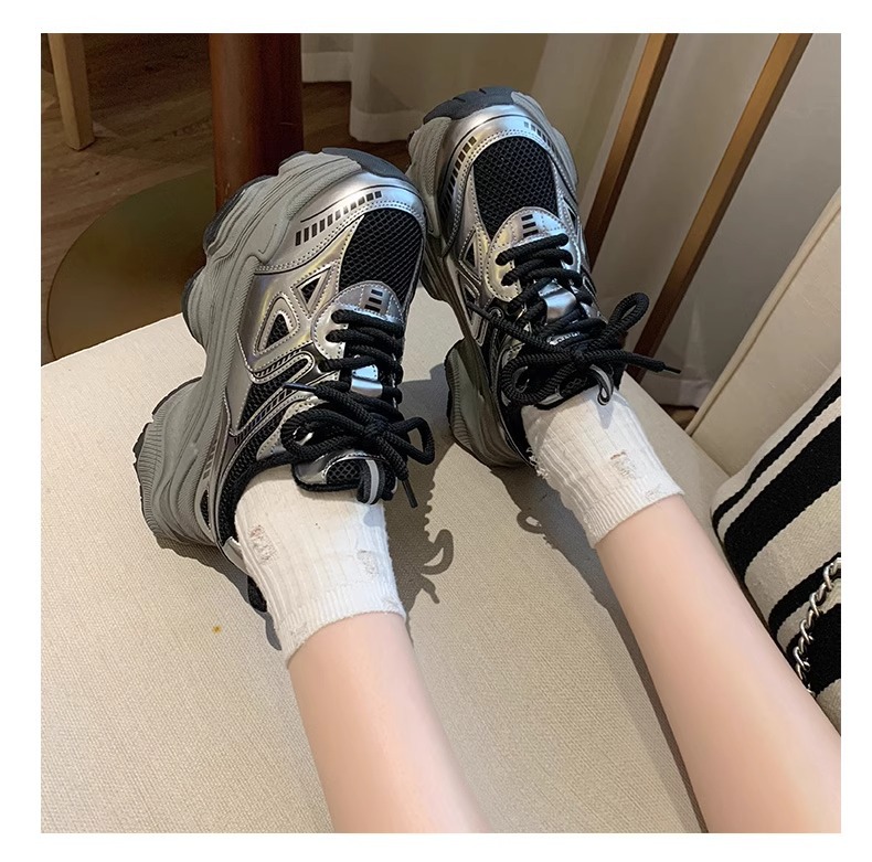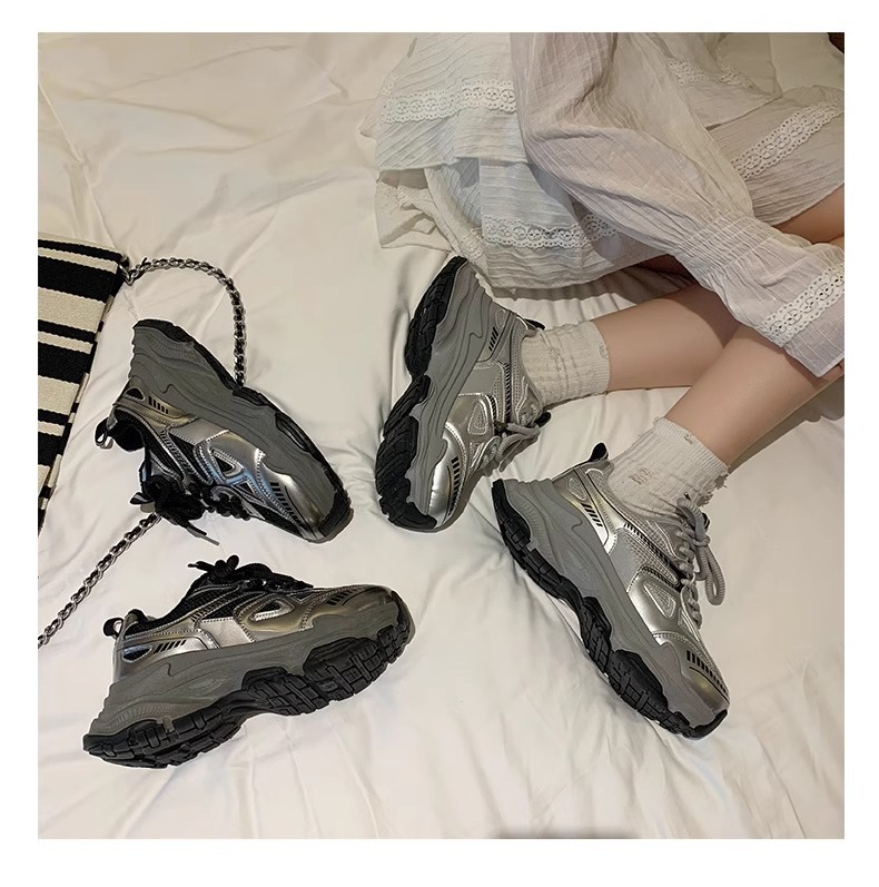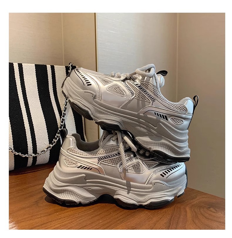 厚い底の銀色のお父さんの靴の女性の金の2025新型の春秋はネットの通気性を高めてパリの運動靴の靴を走ります。
