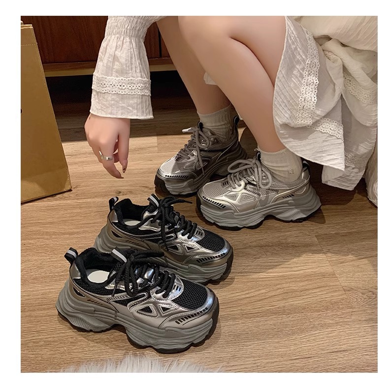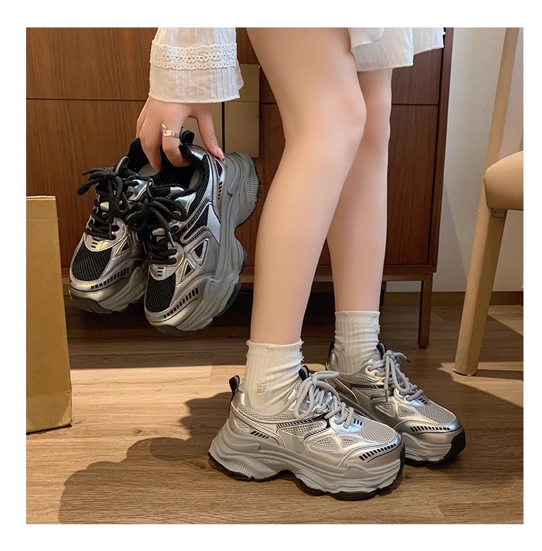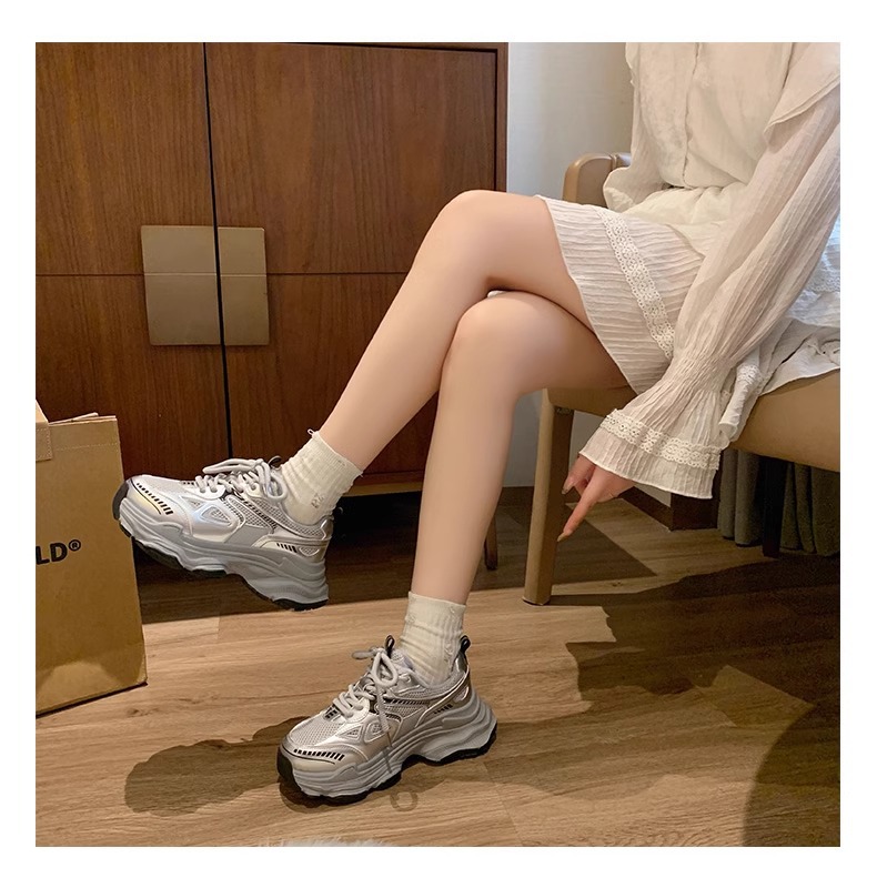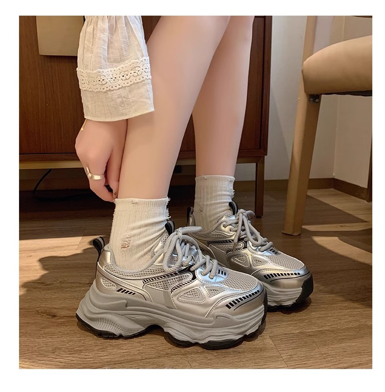 女性靴の厚い底のネットの通気性の銀色のお父さんの靴の2025夏の新型のファッションは高くなって、カジュアルな運動靴に合わせます。