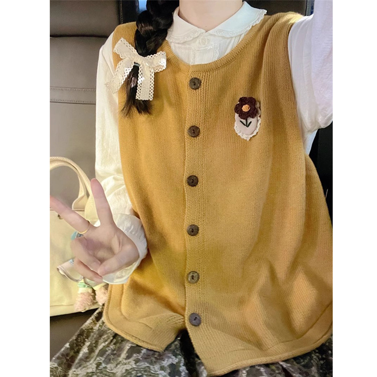 韩系秋装新款通勤百搭圆领排扣短款开衫马甲叠穿无袖针织毛衣背心