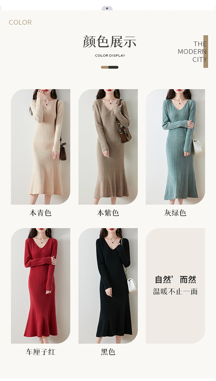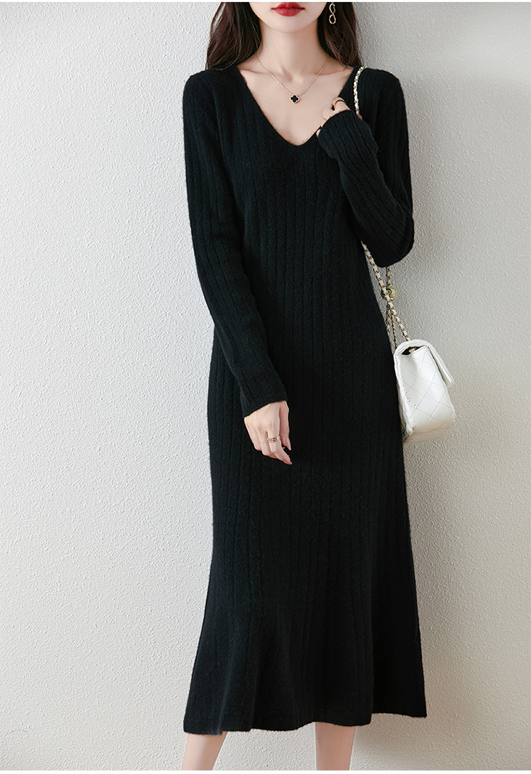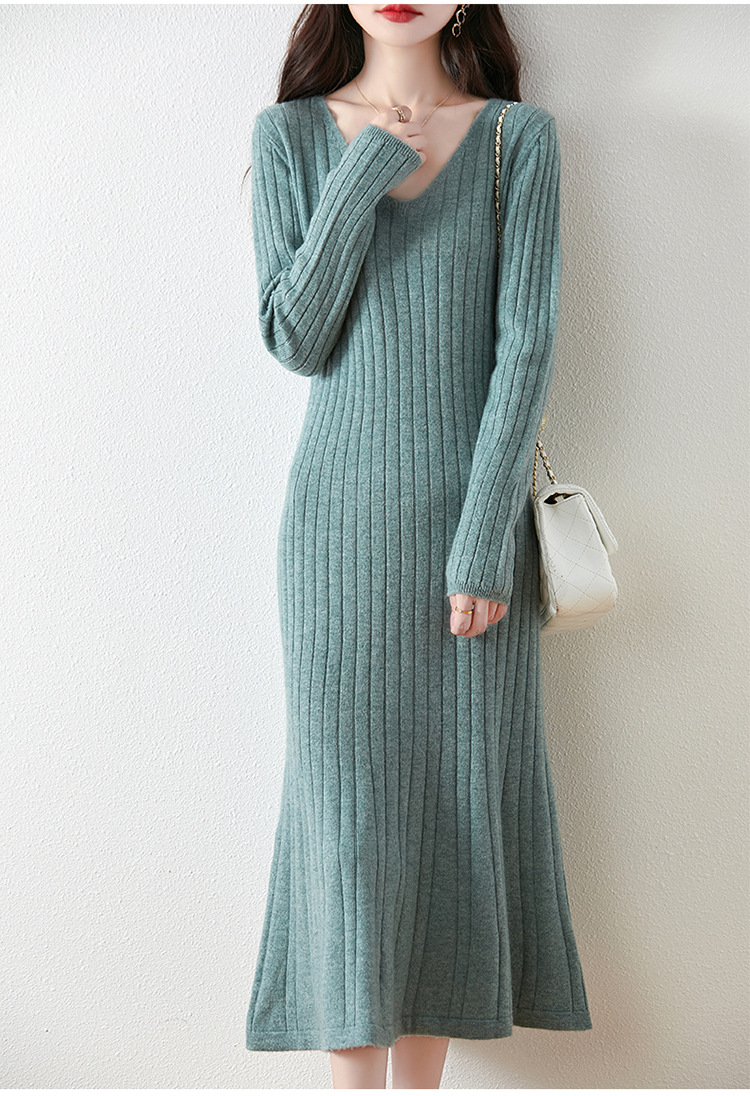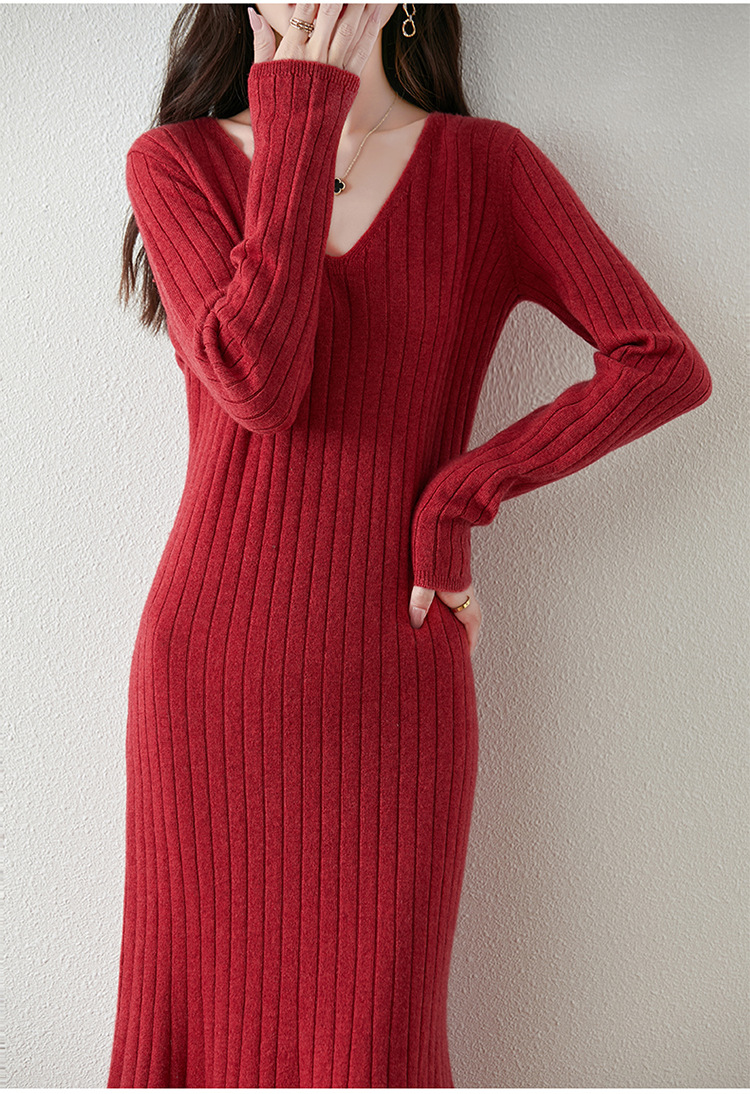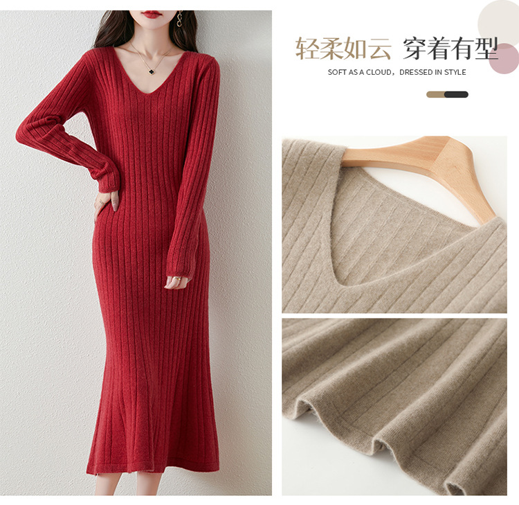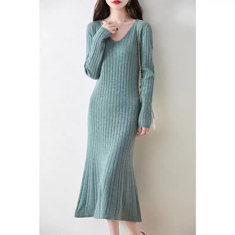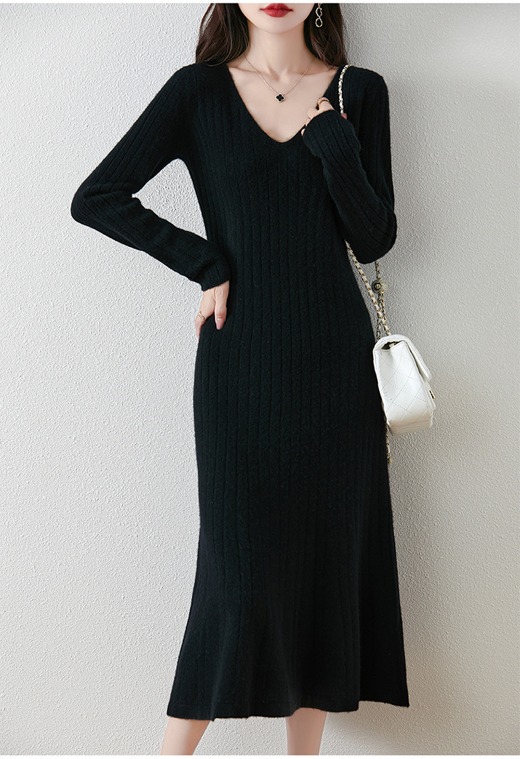 超长款V领针织连衣裙女 秋冬修身包臀打底衫内搭针织毛衣过膝长裙