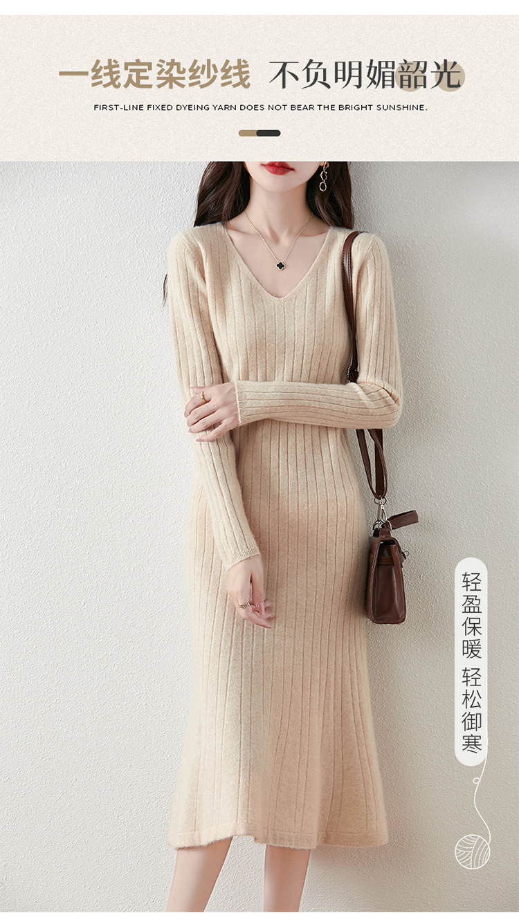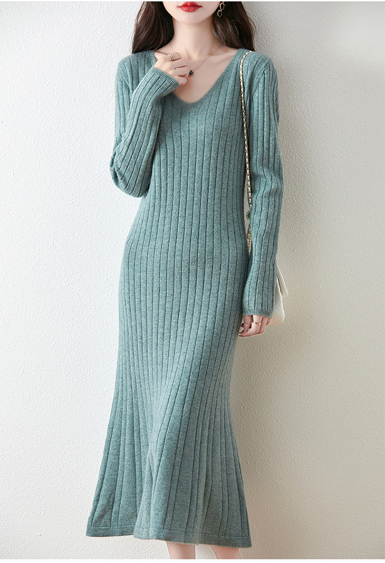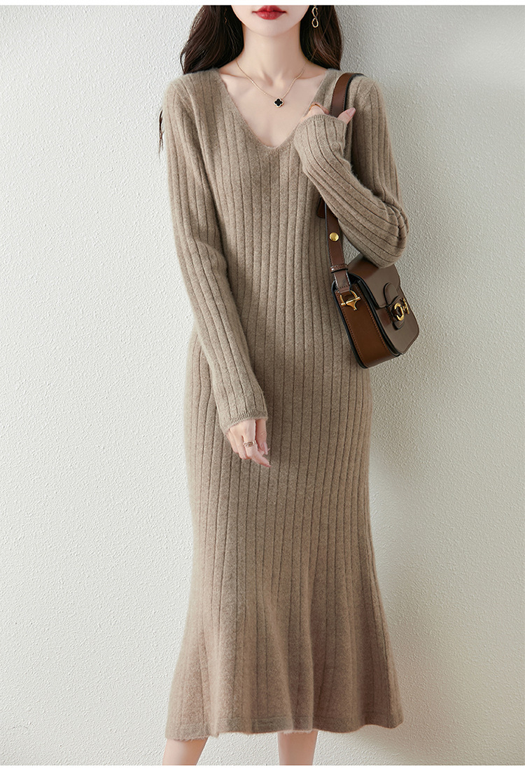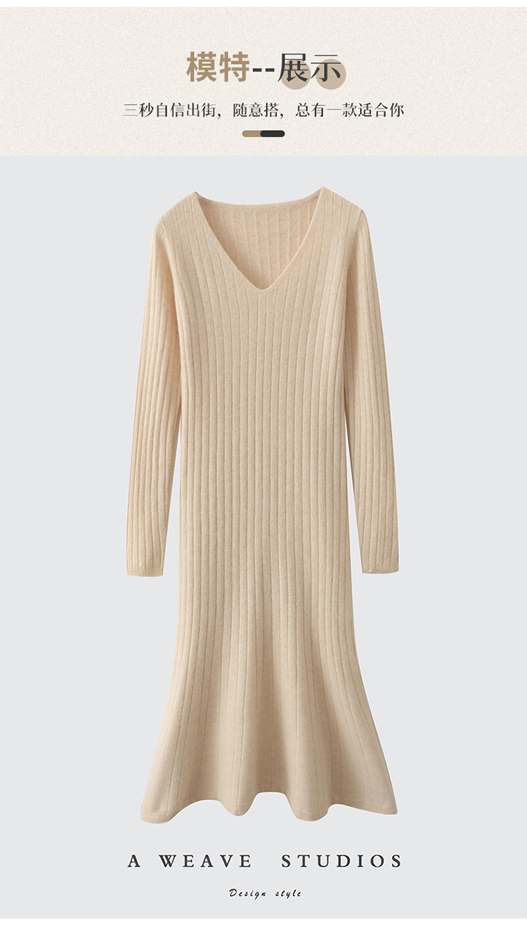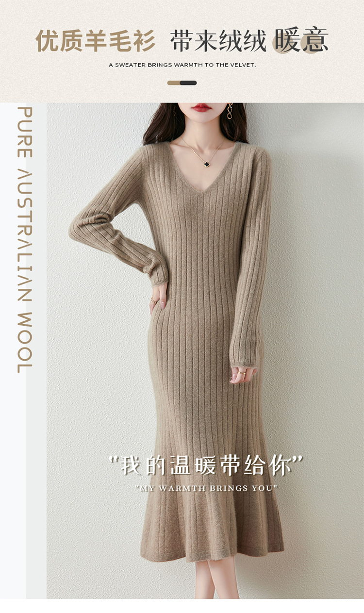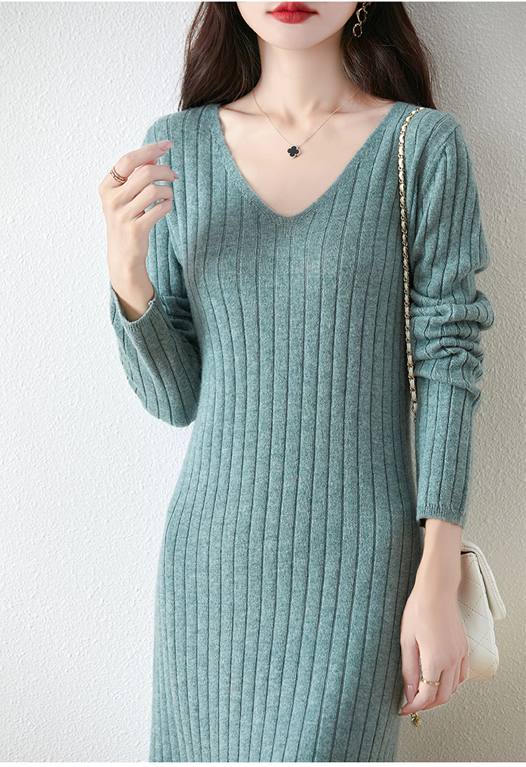 超长款V领针织连衣裙女 秋冬修身包臀打底衫内搭针织毛衣过膝长裙