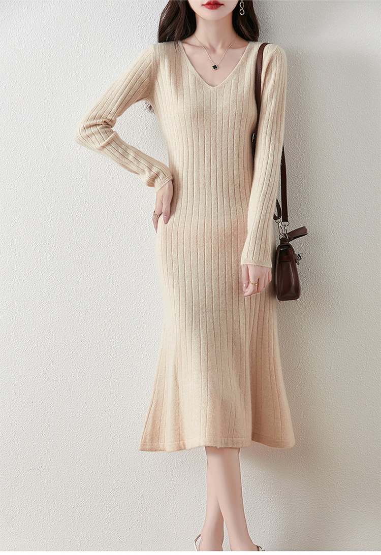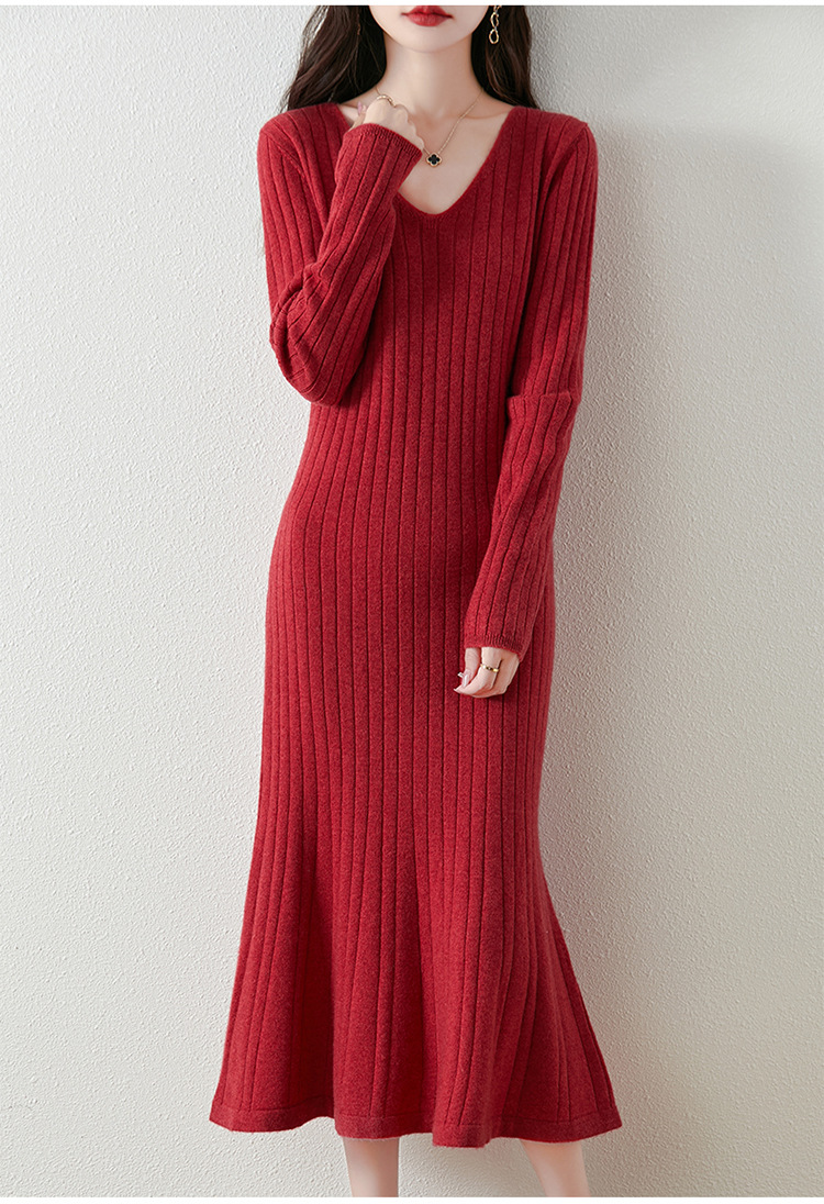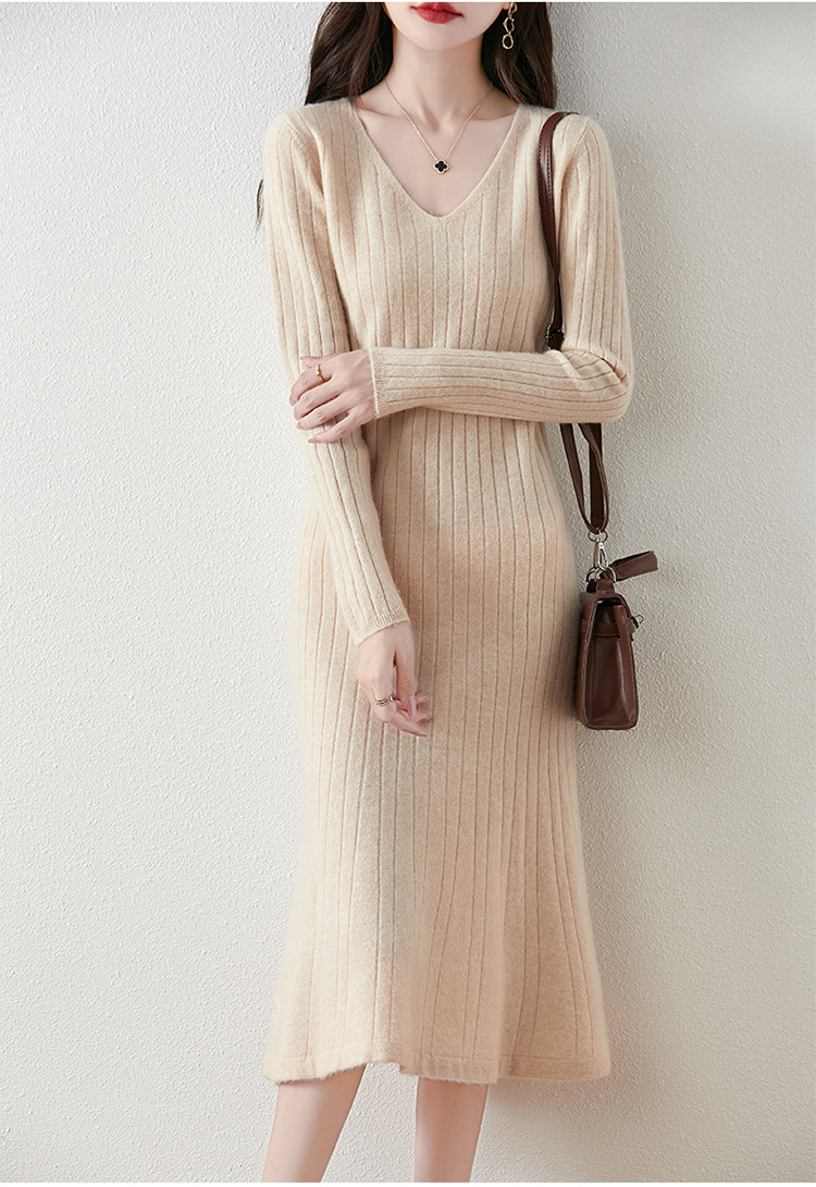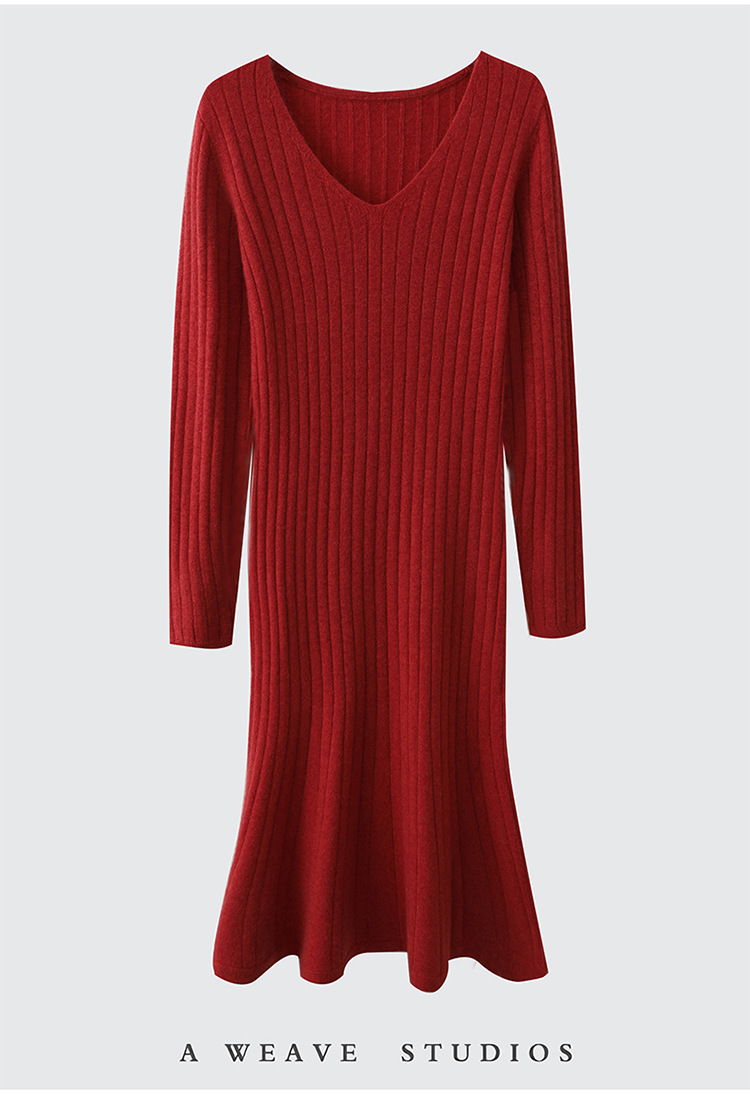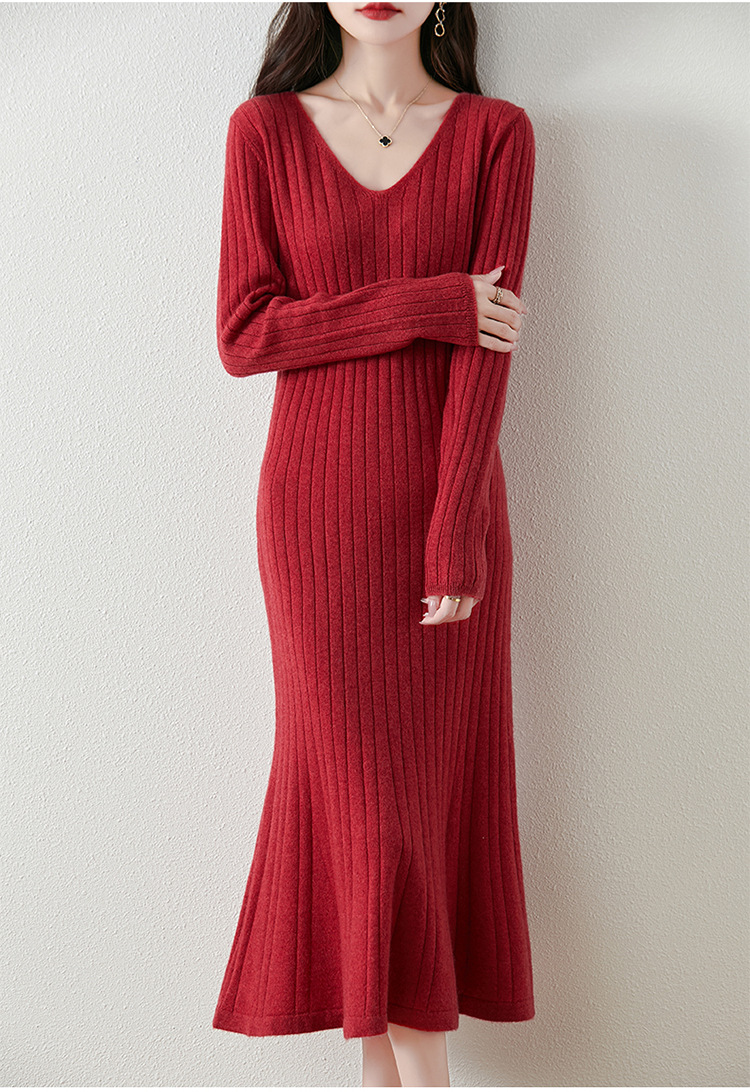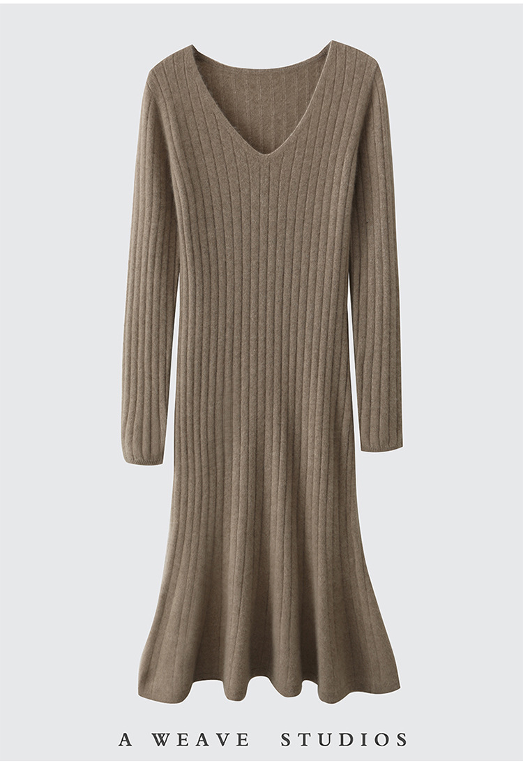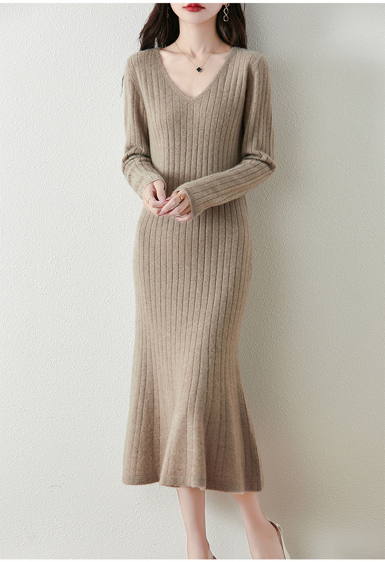 超长款V领针织连衣裙女 秋冬修身包臀打底衫内搭针织毛衣过膝长裙