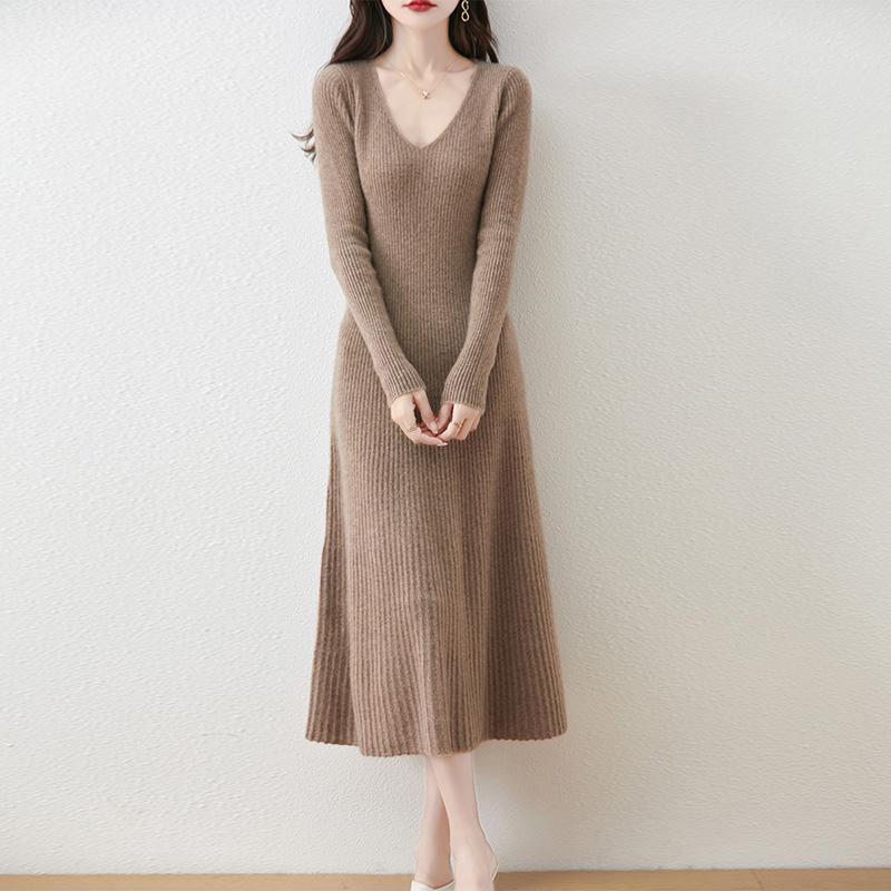 V领套头羊绒连衣裙女秋冬新款百搭长袖休闲长款A字裙羊毛针织长裙
