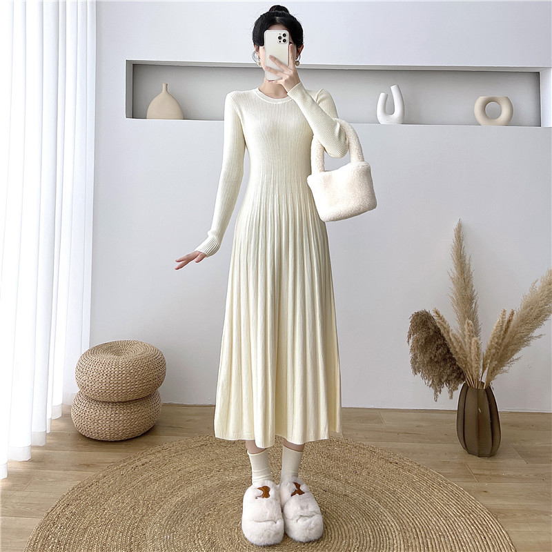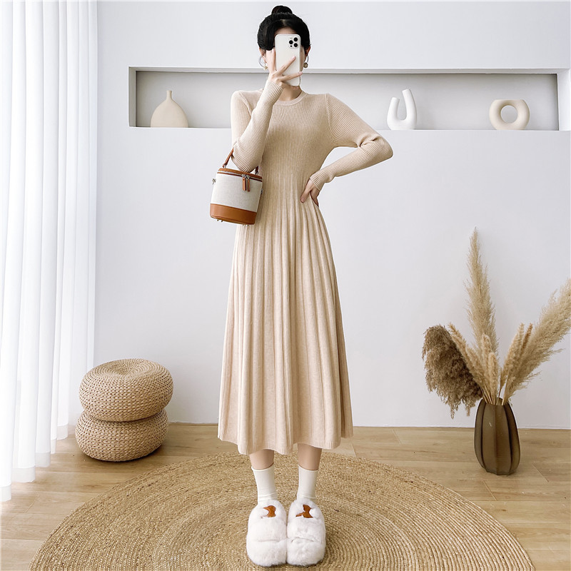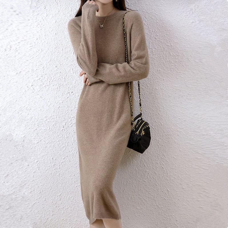 秋冬の新型丸首ワンピースの女性のロングタイプの膝の毛のスカートはゆったりしていて痩せています。