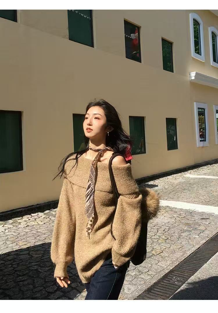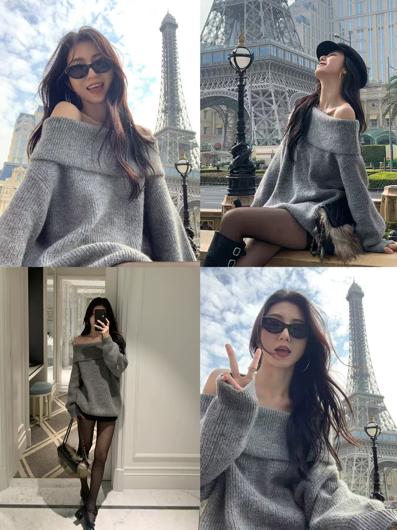 韩系辣妹新款一字领毛衣秋冬气质慵懒宽松露肩中长款上衣针织衫