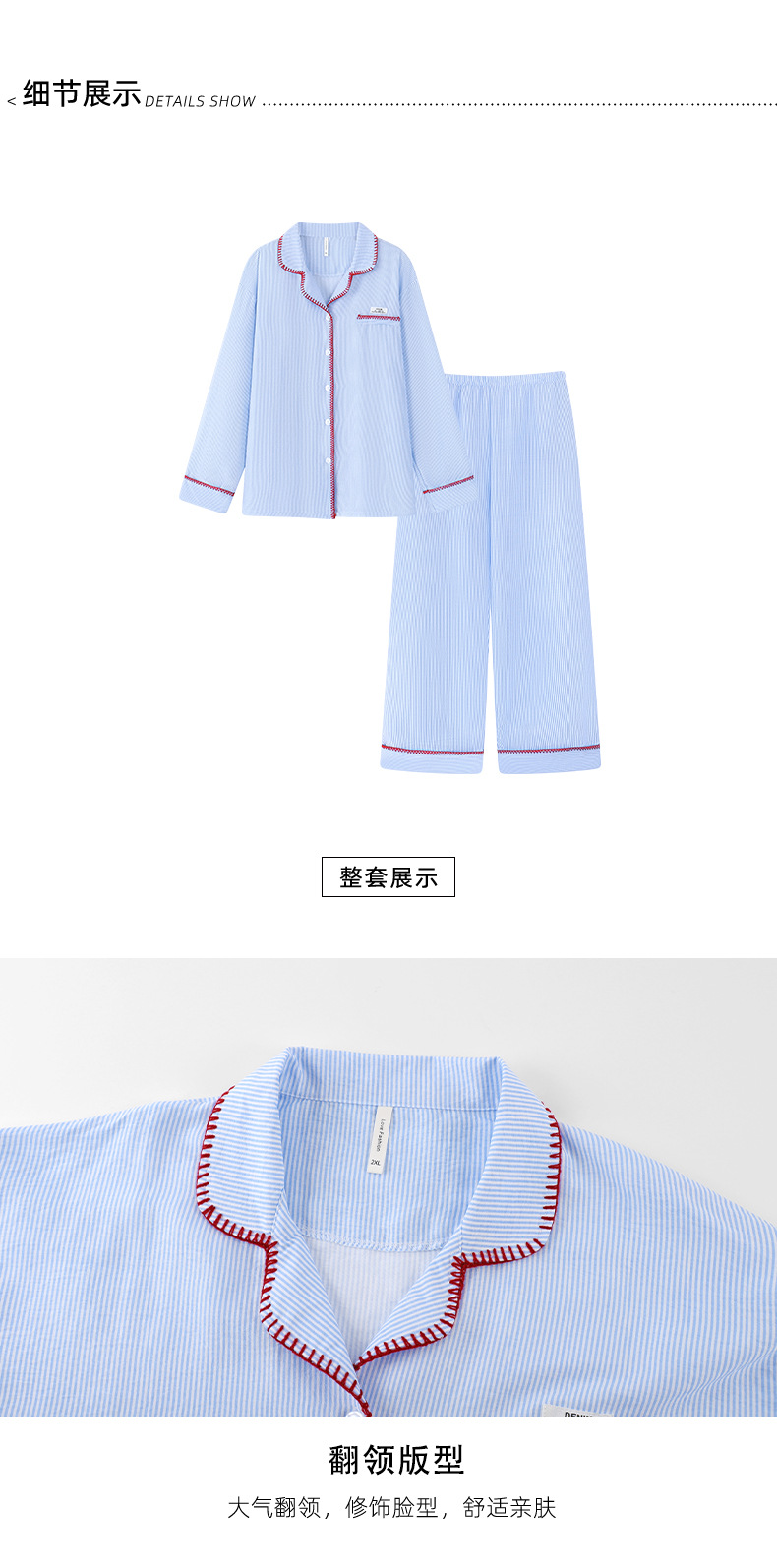 睡衣女条纹长袖开衫拼接撞色大码长裤可外穿家居服秋冬季翻领套装