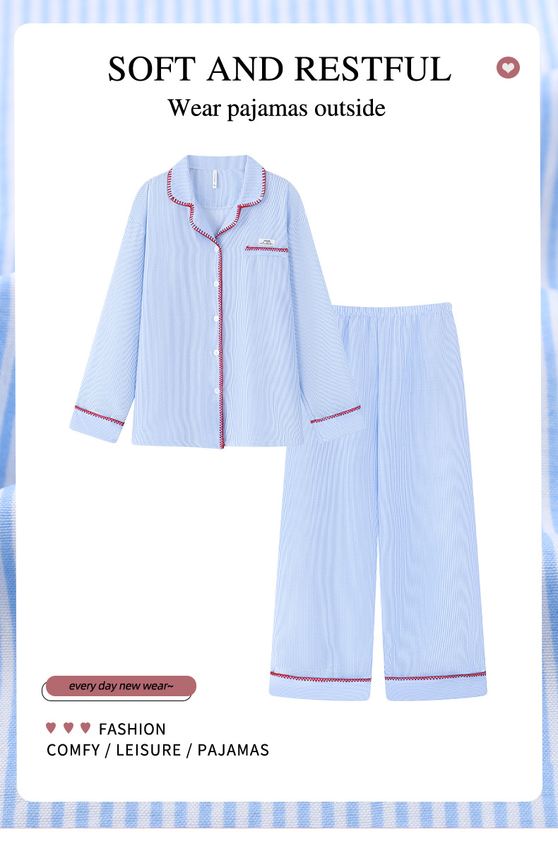 睡衣女秋冬季长袖日系撞色条纹蓝色开衫套装可外穿大码长裤居家服