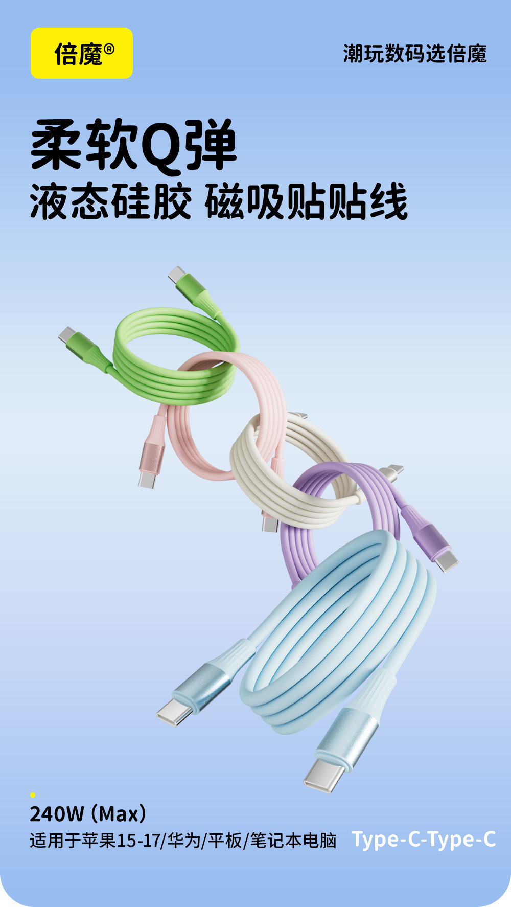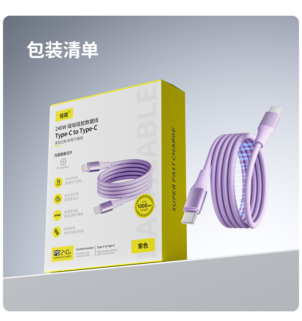 【外贸爆款】倍魔240w磁吸收纳扁数据线适用苹果数据线5A超级快充