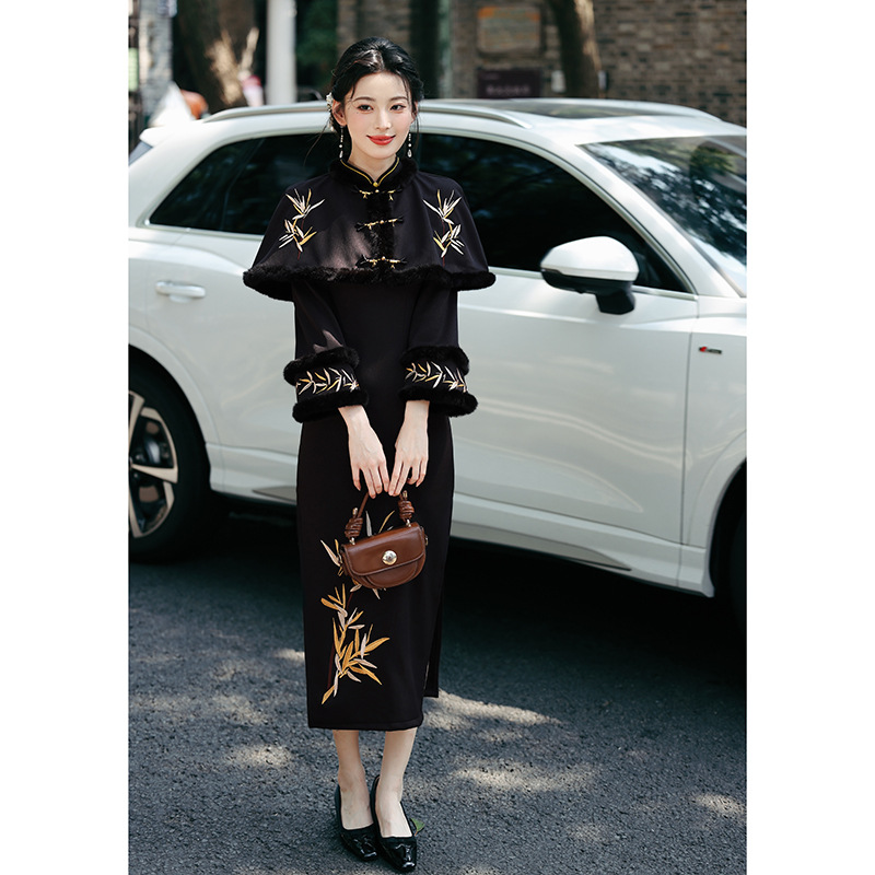 黑色旗袍秋冬季新款长袖加绒加厚保暖气质高贵披肩套装中式冬装女