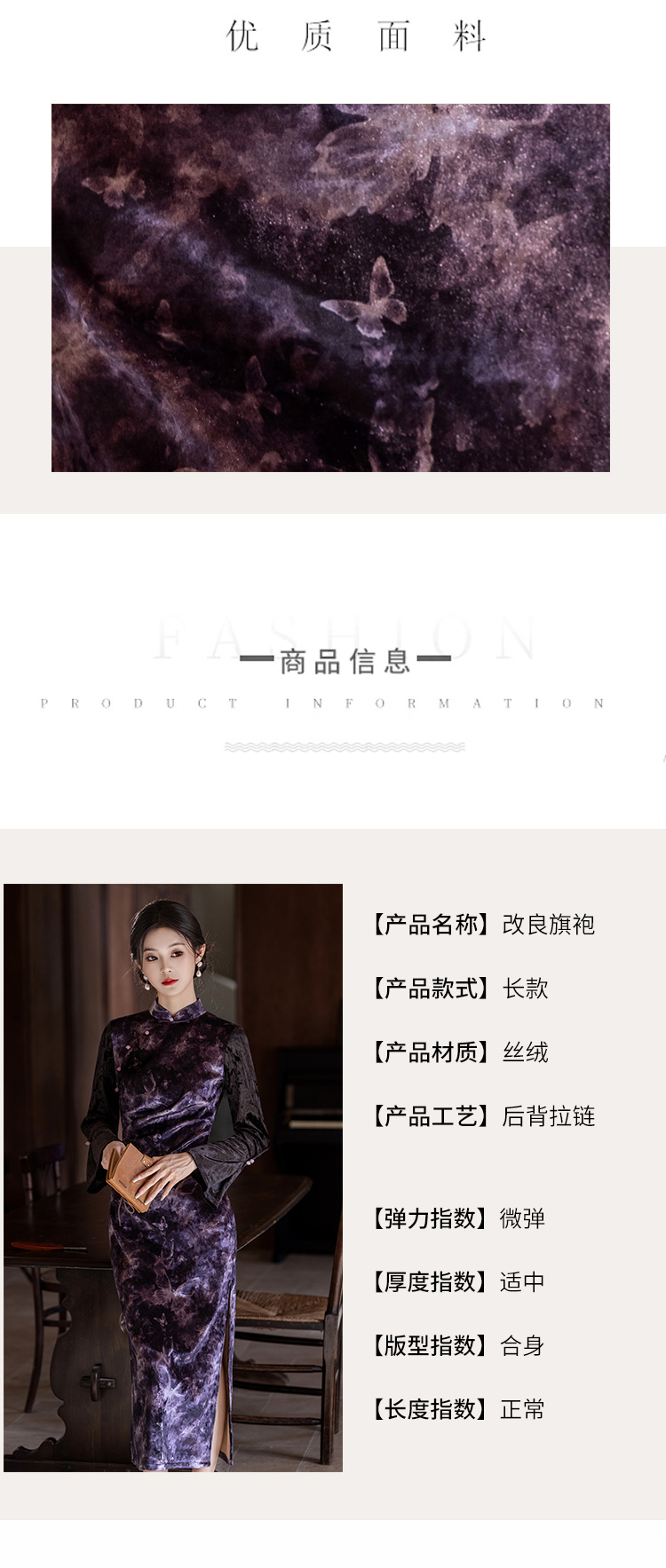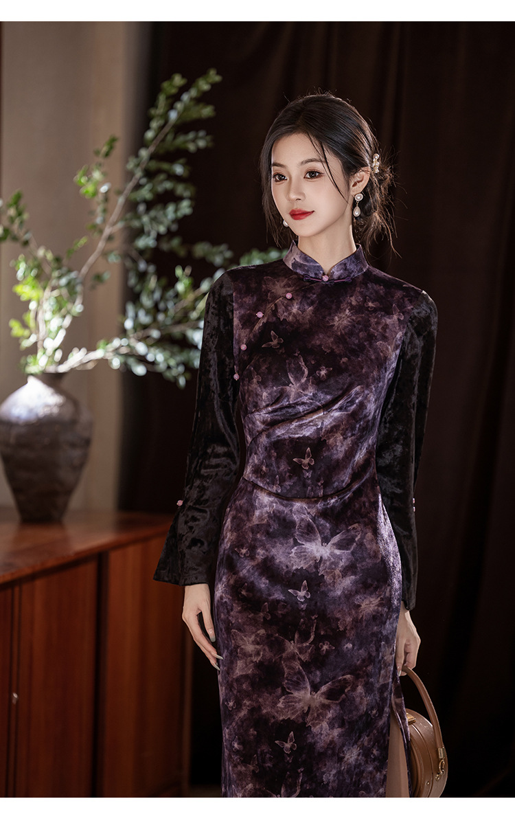 国风新中式气质黑色丝绒蝴蝶长袖旗袍日常显瘦紫色少女长款连衣裙