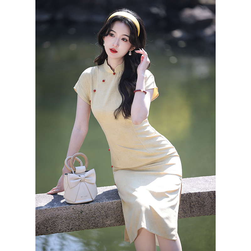 小柄なチャイナドレスの若いタイプの少女は夏2025年の新しい出勤はワンピースの黄色の新しい中国風を着ることができます。