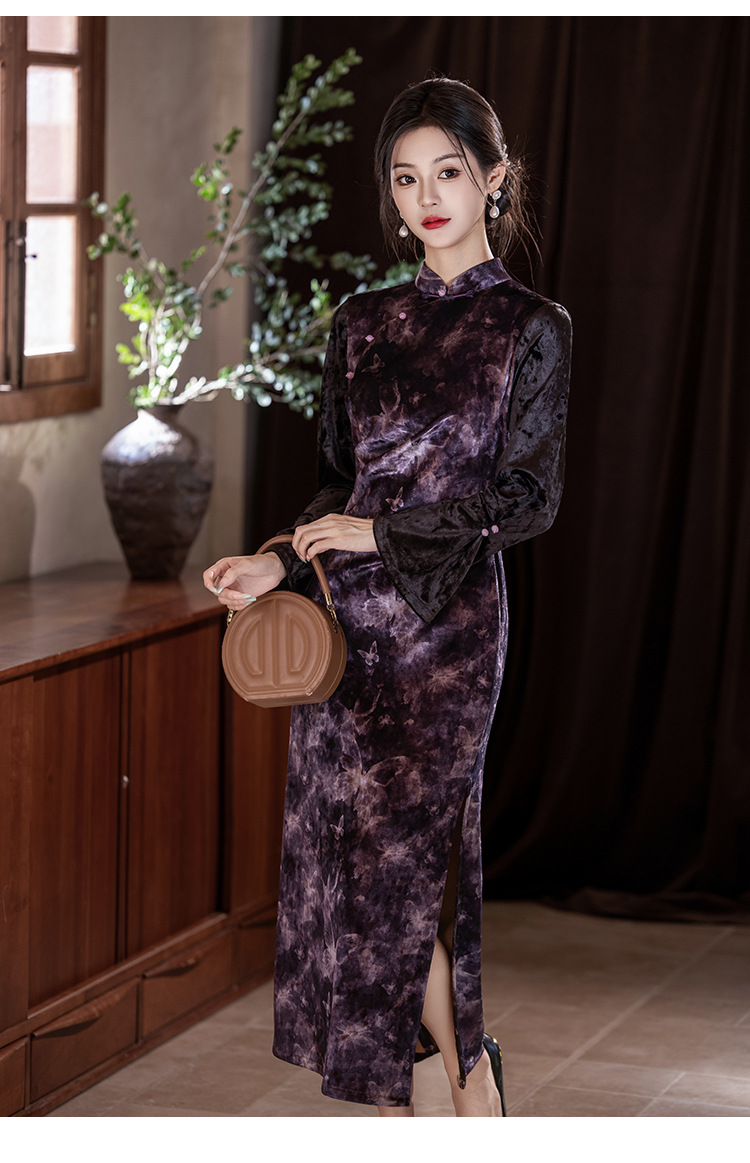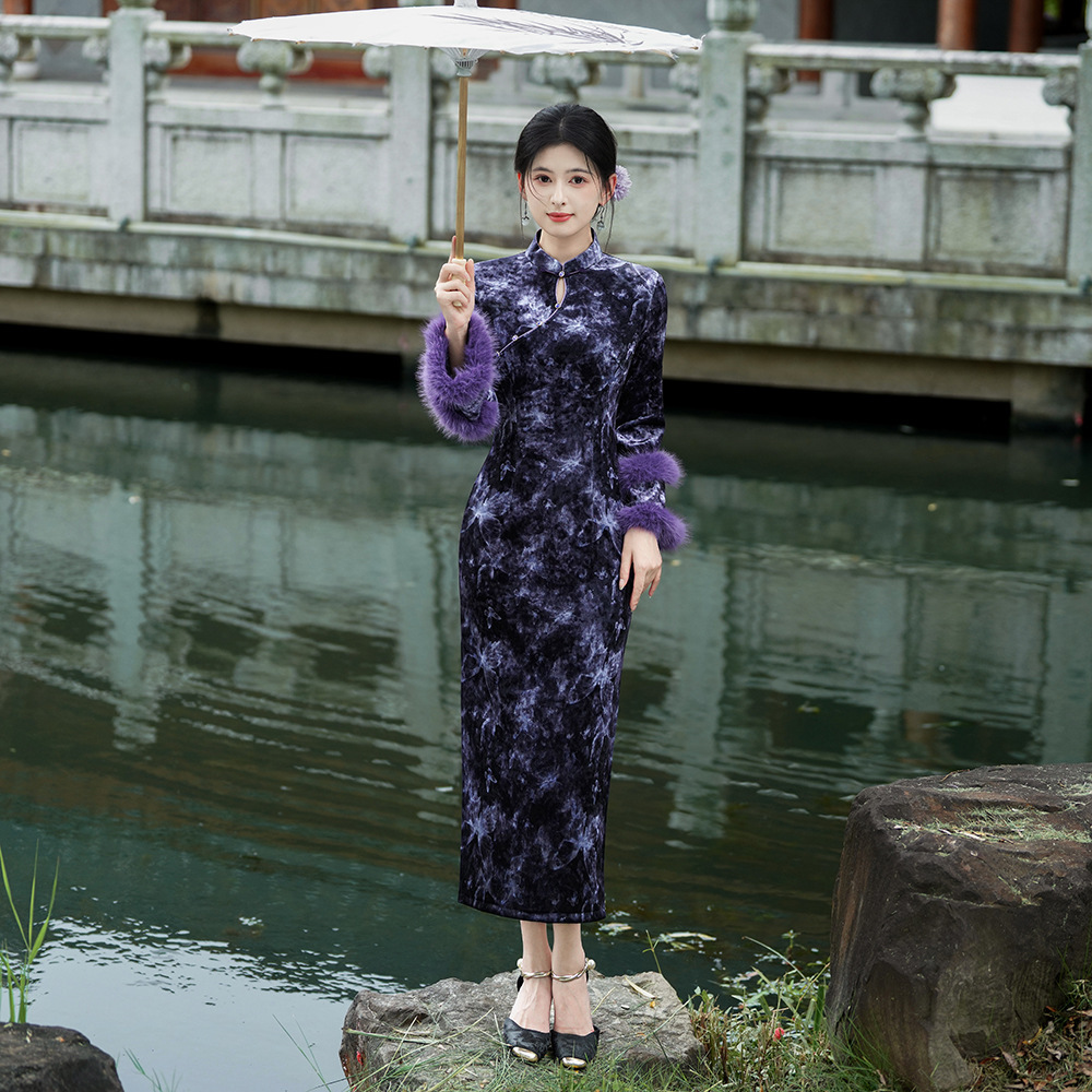 丝绒长款旗袍2025秋冬新款复古国风改良新中式日常修身长袖旗袍