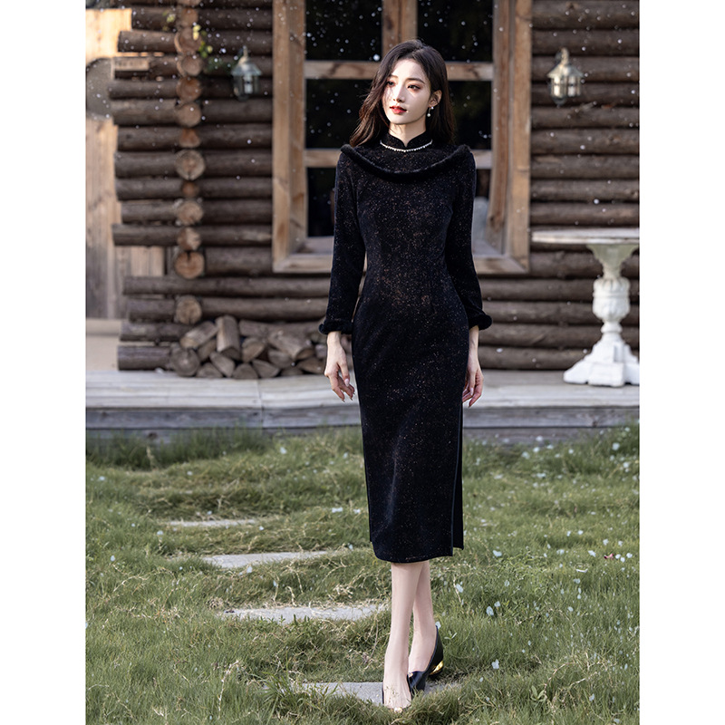 秋冬新款加绒加厚黑色显瘦旗袍新中式改良复古日常可穿长连衣裙女
