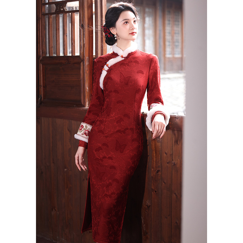 红色旗袍秋冬季长袖加绒加厚敬酒服新中式订婚礼服少女日常连衣裙