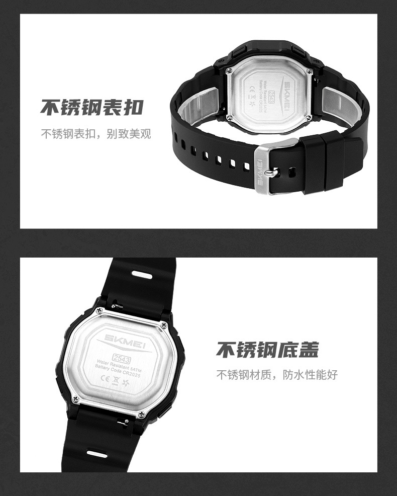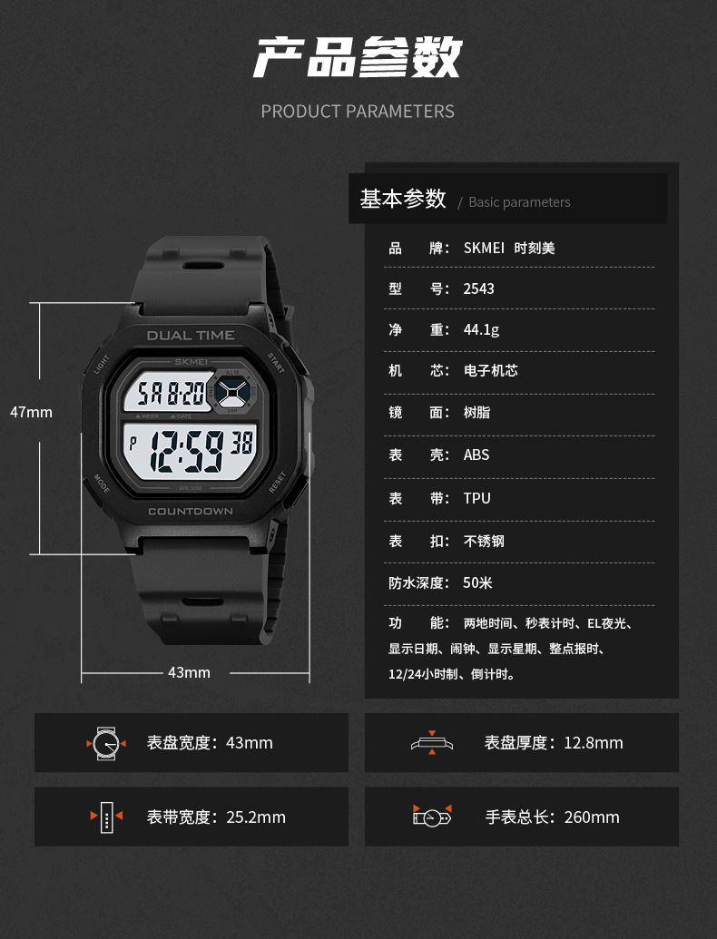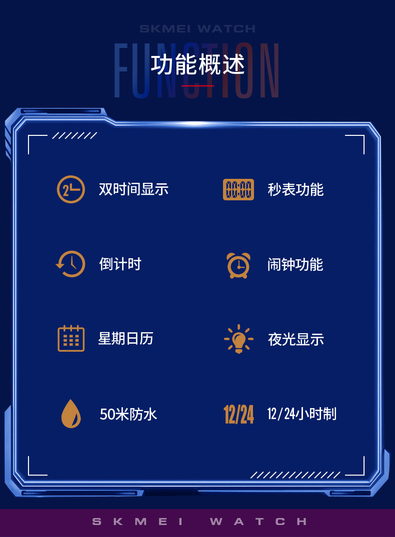 功能:2时间、秒表计时、日期、闹钟、星期、EL夜光、整点报时、12/24小时制、倒计时。