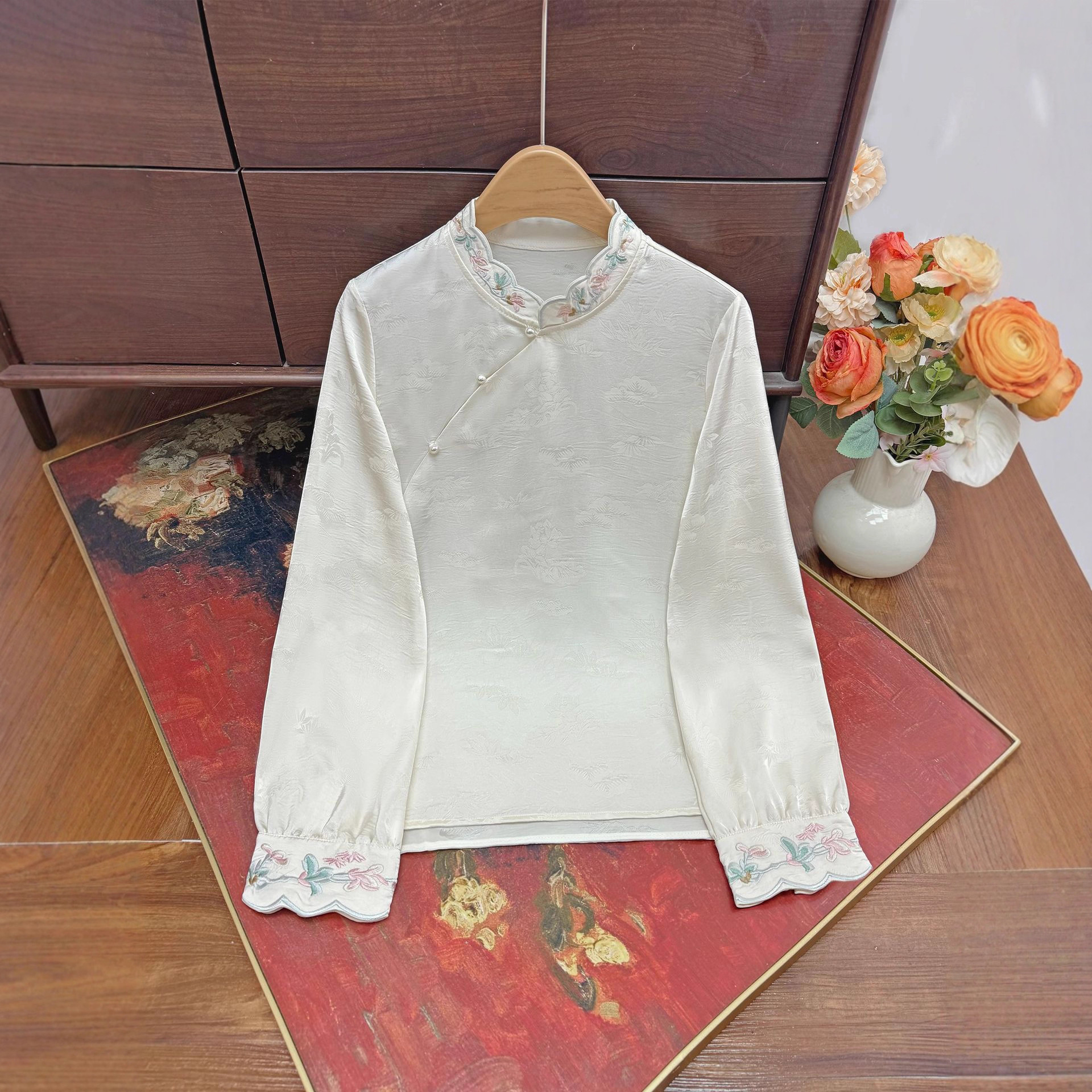 新中式国风刺绣提花衬衣2025秋季新款立领套头小衫百搭内搭上衣女