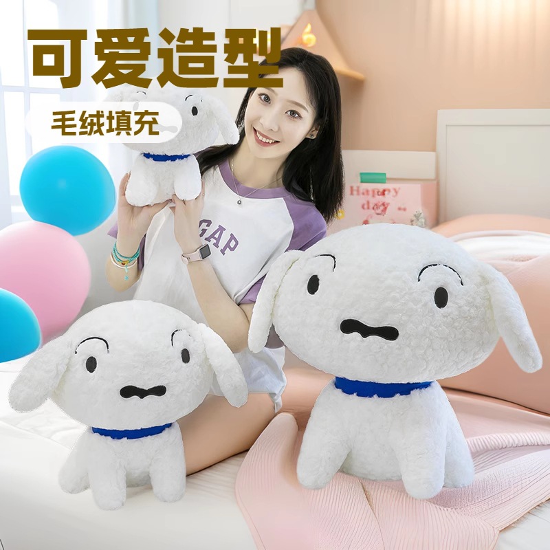 クレヨンしんちゃんの白い犬の人形が寝て、ぬいぐるみの女の子のかわいい人形のおもちゃの子供のプレゼントの女性をなだめる