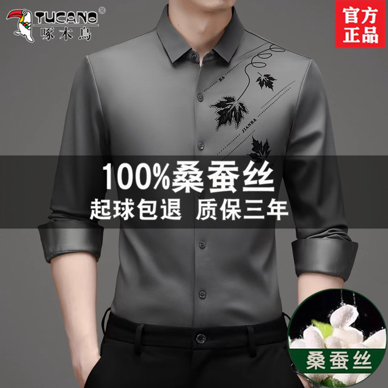 キツツキの長袖のシャツの男性の绢糸の薄い金はハイエンドのシルクの無傷のシャツの中年のカジュアルな春秋服にアイロンをかけません。