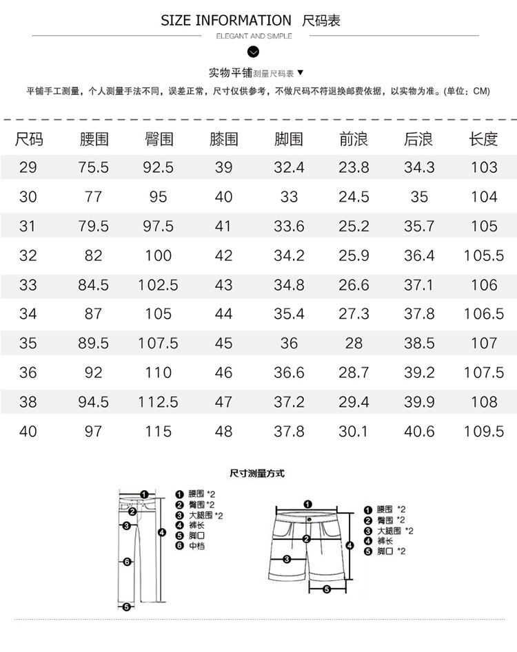 尺码 29 腰围2.2尺,30 腰围2.3尺,31 腰围2.4尺,32 腰围2.5尺,33 腰围2.6尺,34 腰围2.7尺,35 腰围2.8尺,36 腰围2.9尺,38 腰围3.1尺,40 腰围3.3尺