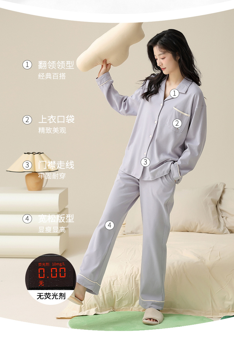 【100%纯棉】情侣睡衣女春秋季长袖开衫套装纯色简约宽松男家居服