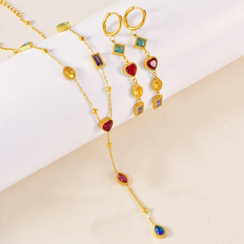 フランスのハイエンドのカラフルなロングタッセル鎖骨チェーンライト高級ラブドロップダイヤモンドイヤリングエレガントな気質ネックレスセット