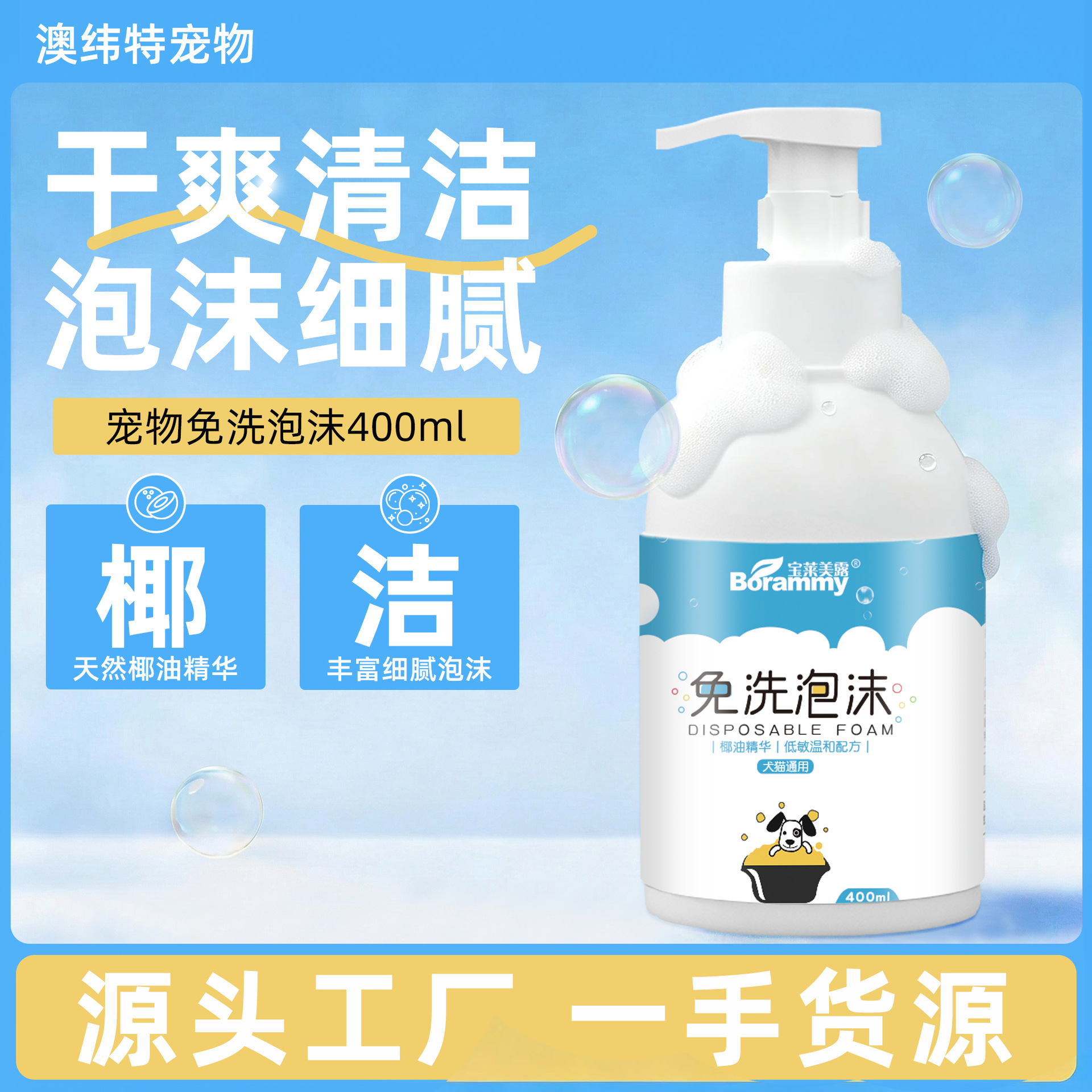 工厂宠物免洗泡沫批发猫咪沐浴露400ml狗狗免洗手套身体清洁湿巾