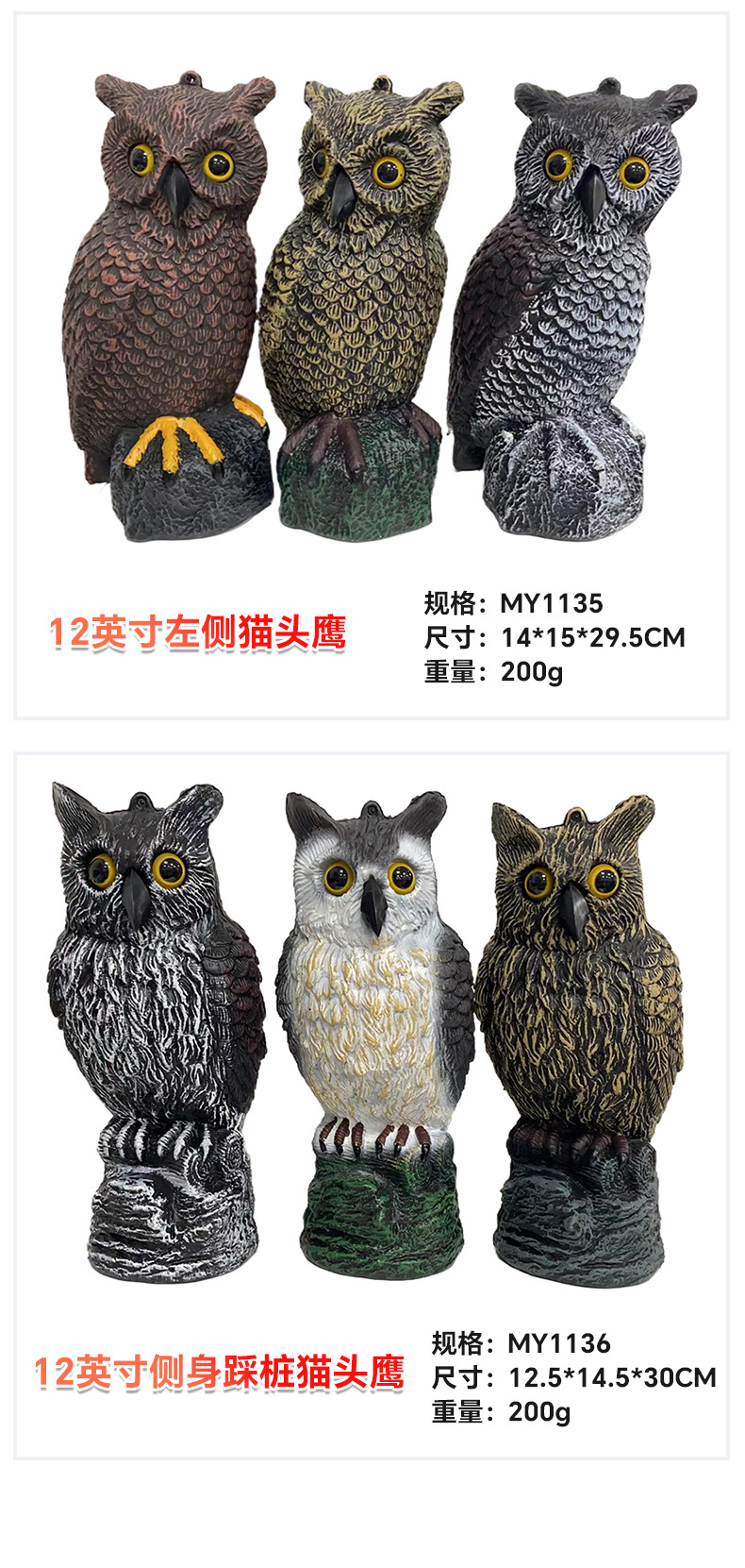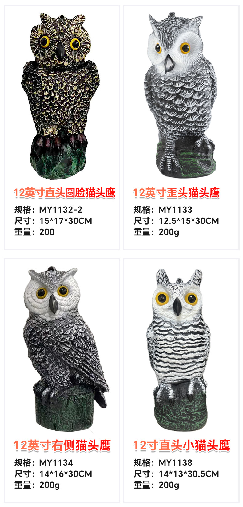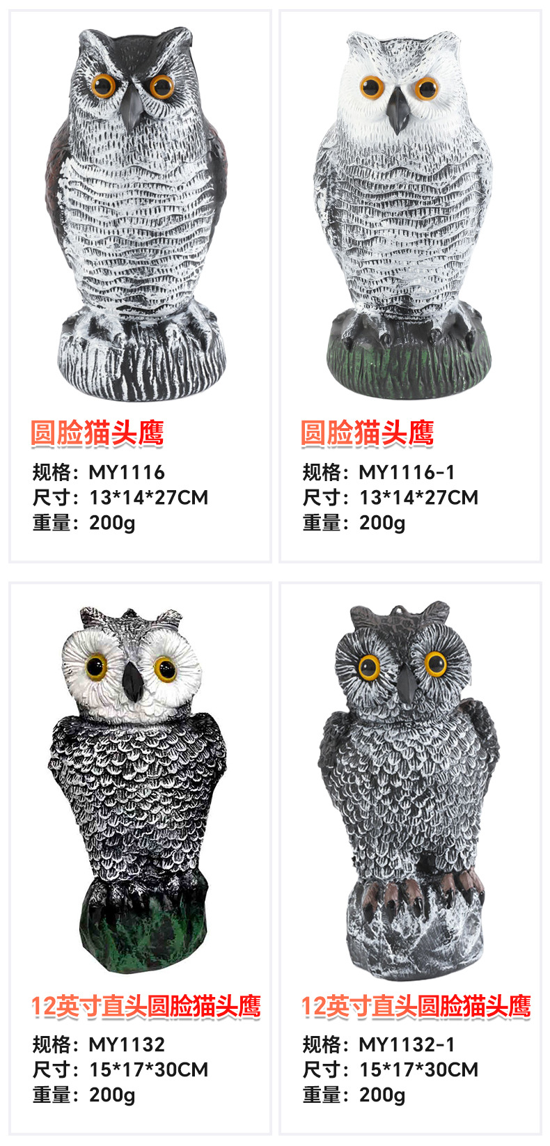 颜色 MY1102红背弯头猫,MY1103摇头猫头鹰,MY1103-1胖头摇头猫头鹰,MY1105黄肚弯头猫,MY1105-1绿肚弯头猫,MY1106直头猫头鹰,MY1112-1长耳猫头鹰-白色,MY1112长耳猫头鹰-红色,MY1115-1白脸猫头鹰-白色,MY1115白脸猫头鹰-红色,MY1116-1圆脸猫头鹰-白色,MY1116圆脸猫头鹰-红色,MY1132-1(12寸直头圆脸猫头鹰),MY1133(12寸歪头猫头鹰),MY1134(12寸右侧猫头鹰),MYS1103(电子发声摇头猫头鹰),MY1136(12寸踩桩猫头鹰),MY1138(12寸直头小猫),MY8002E太阳能电子弯头猫头鹰,MY8050D镭射发声猫头鹰,猫头鹰眼珠配件