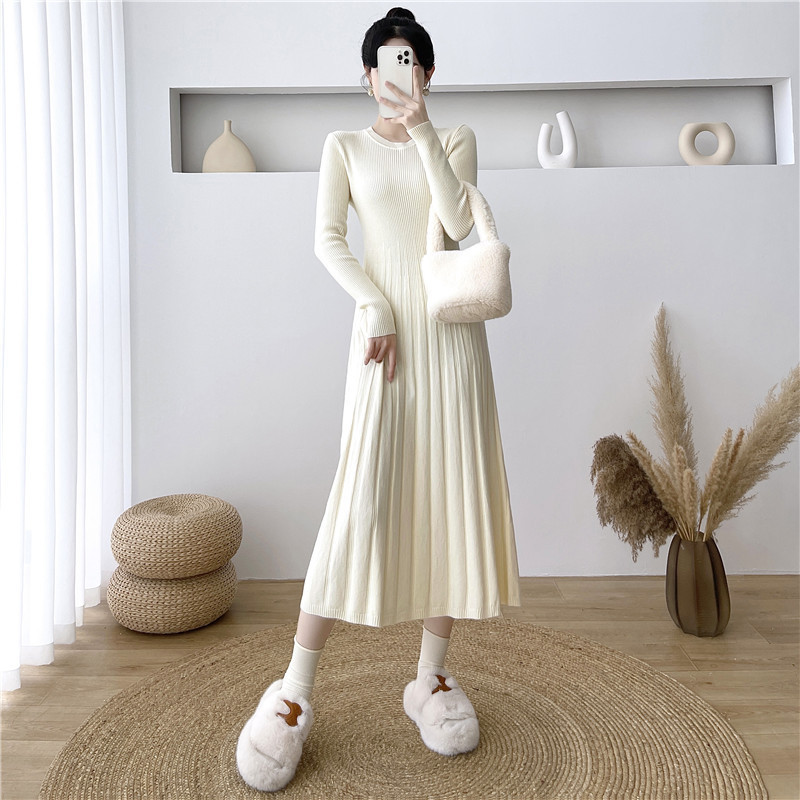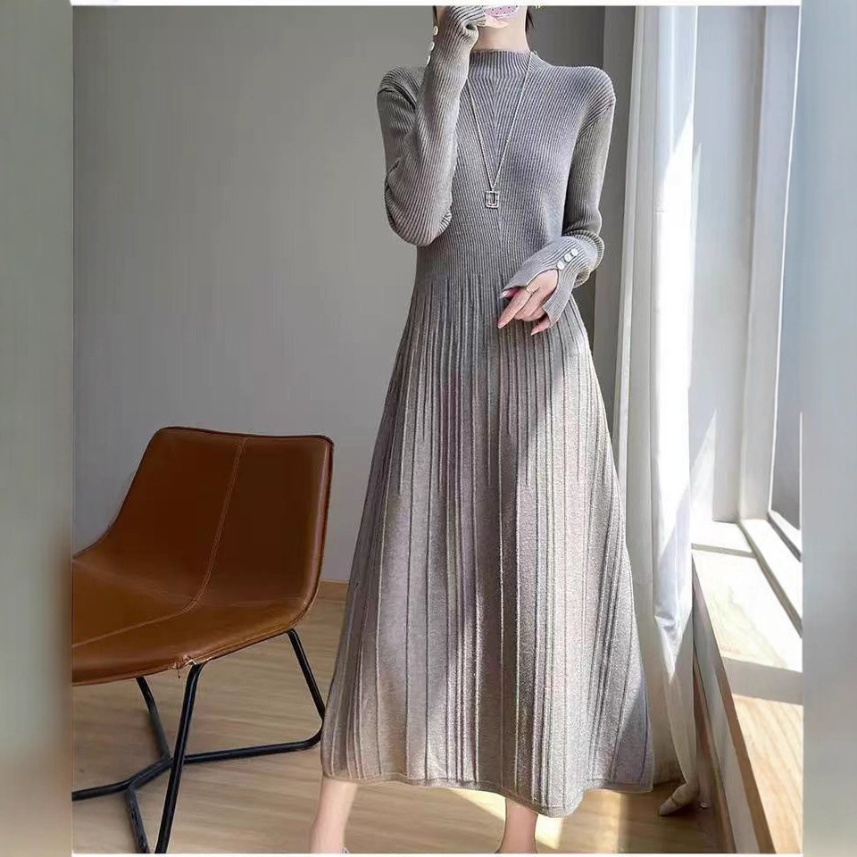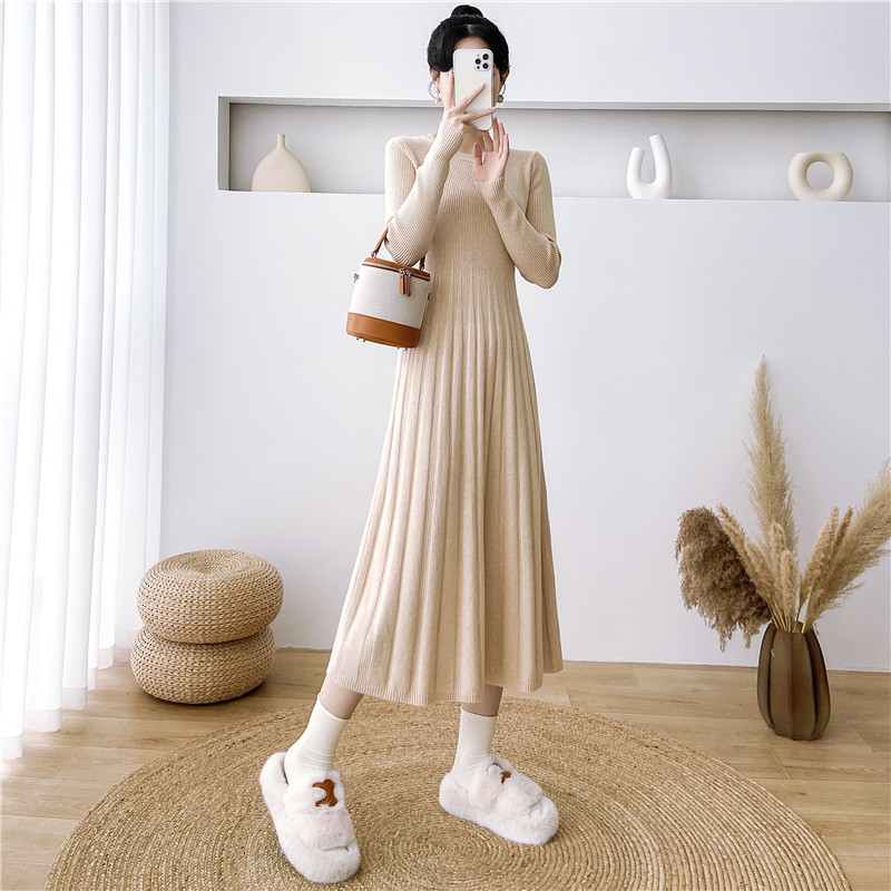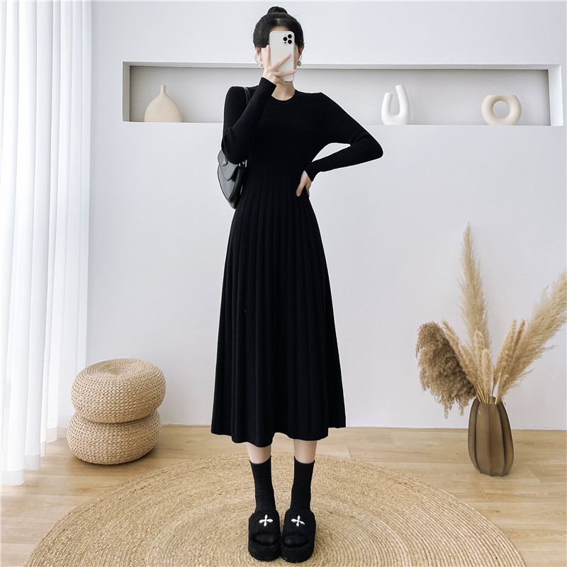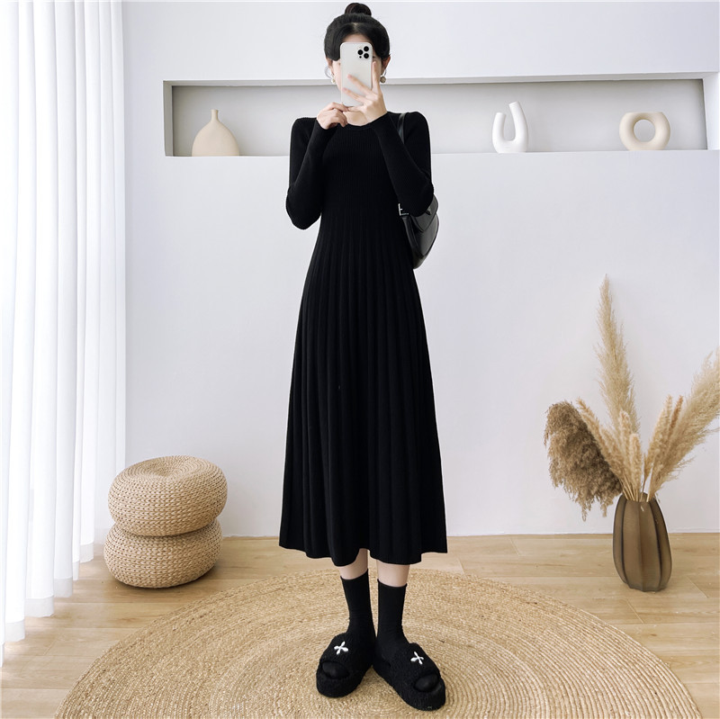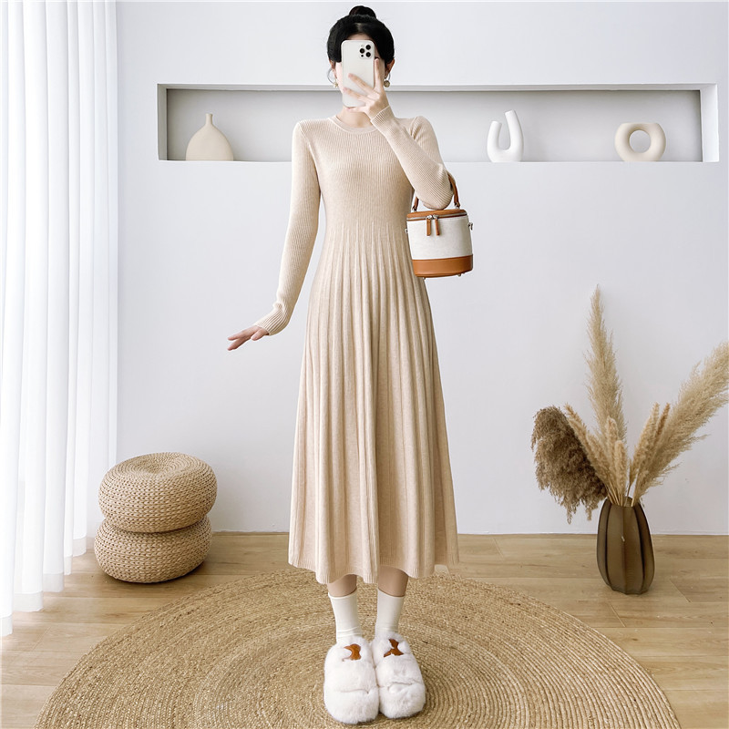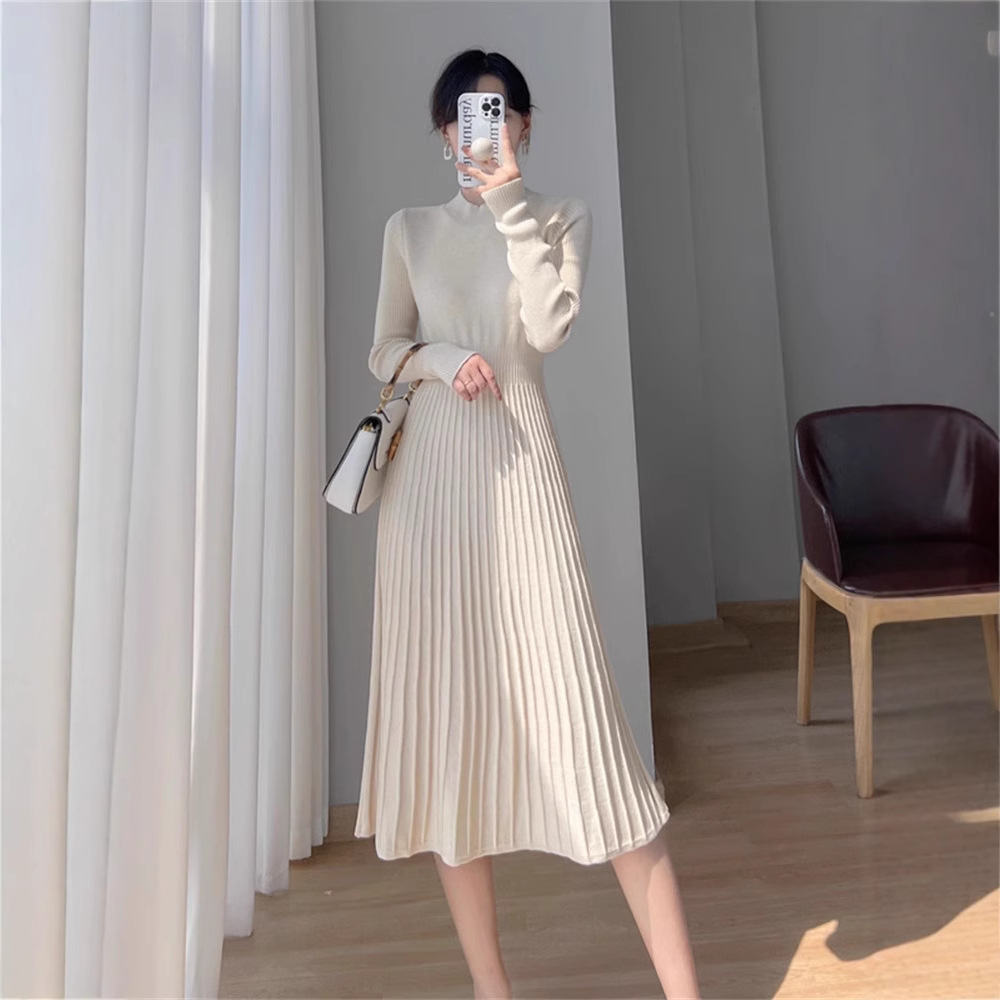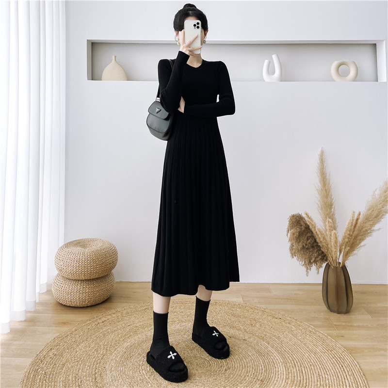 2025秋冬打底连衣裙纯色百搭长袖修身百褶藏肉配大衣针织A字长裙