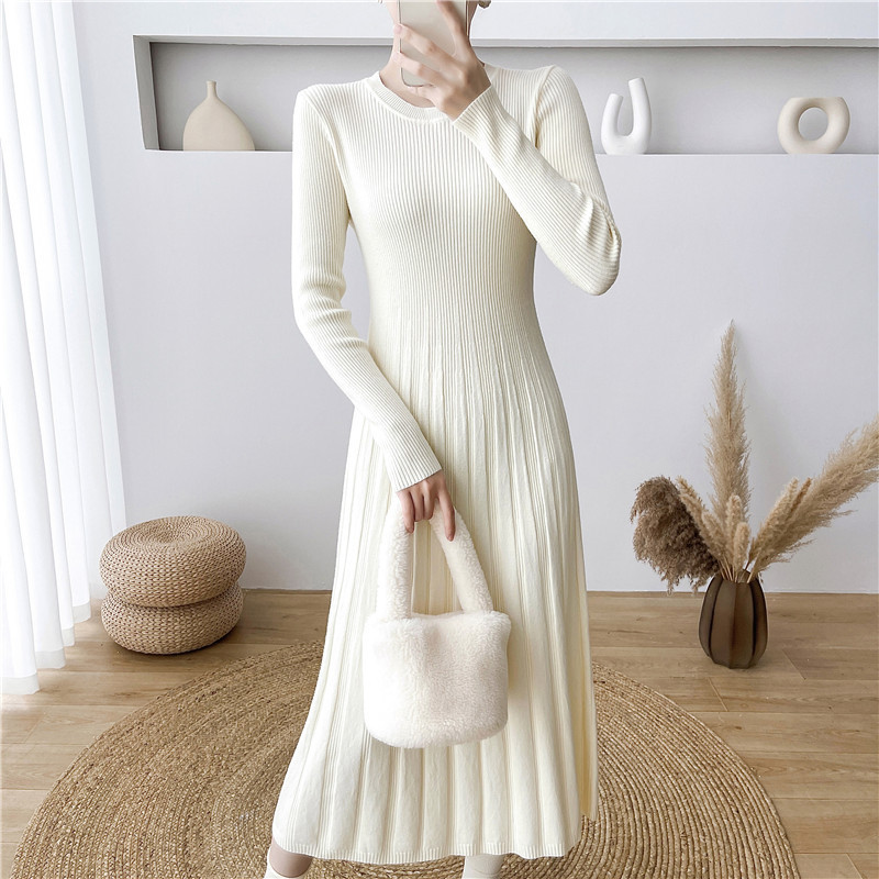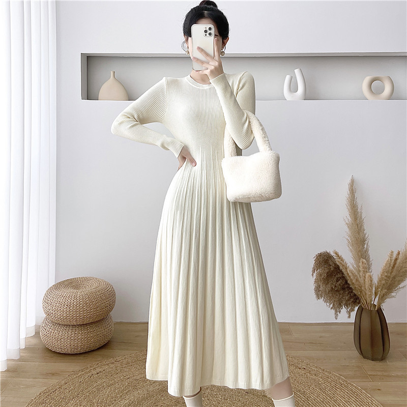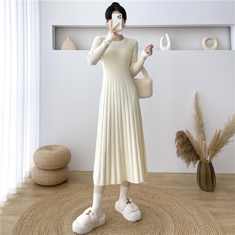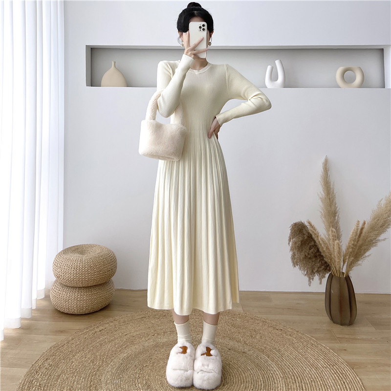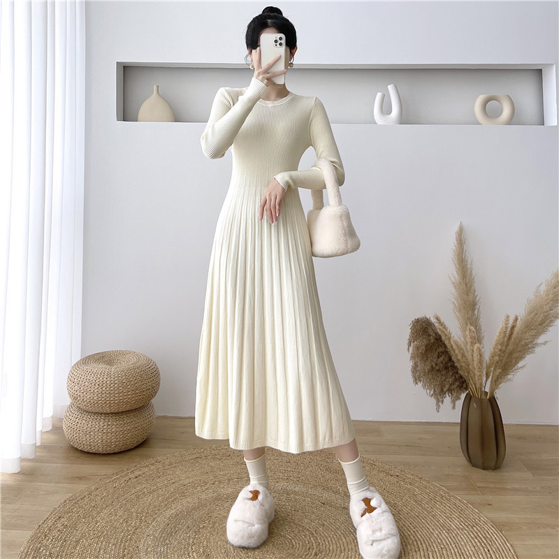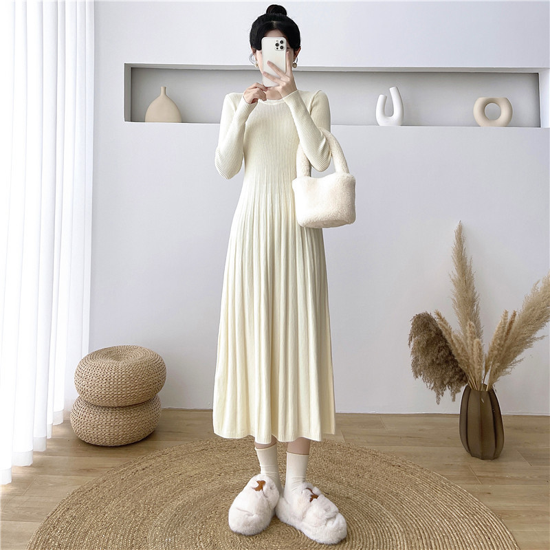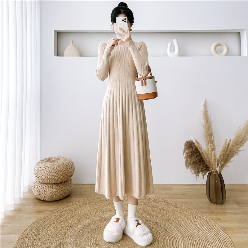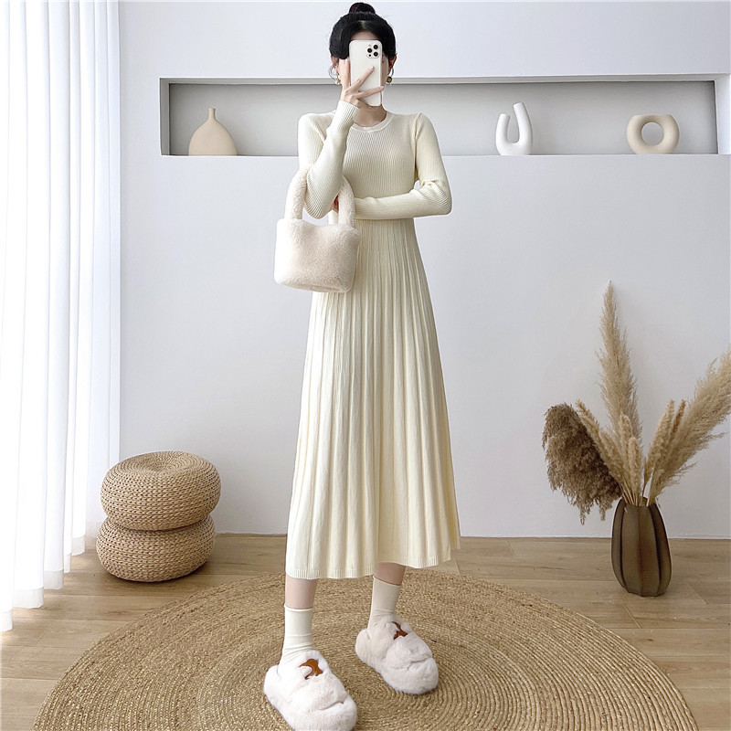 2025秋冬打底连衣裙纯色百搭长袖修身百褶藏肉配大衣针织A字长裙