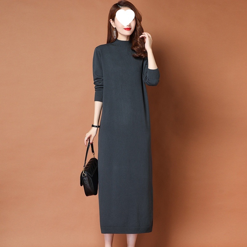 秋冬半高领连衣裙女超长款宽松慵懒风配大衣过膝软糯打底针织裙子