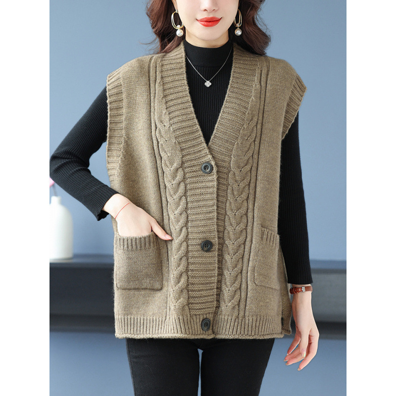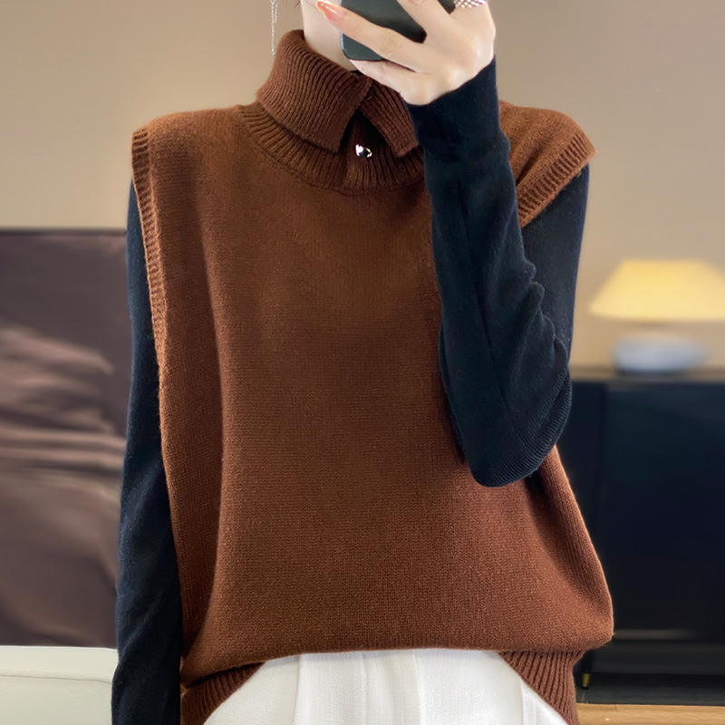 韓国風ゆったり重ね着ノースリーブセーターデザインベスト、襟付きニットベスト、レディース万能無地